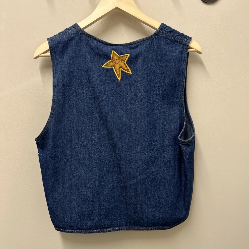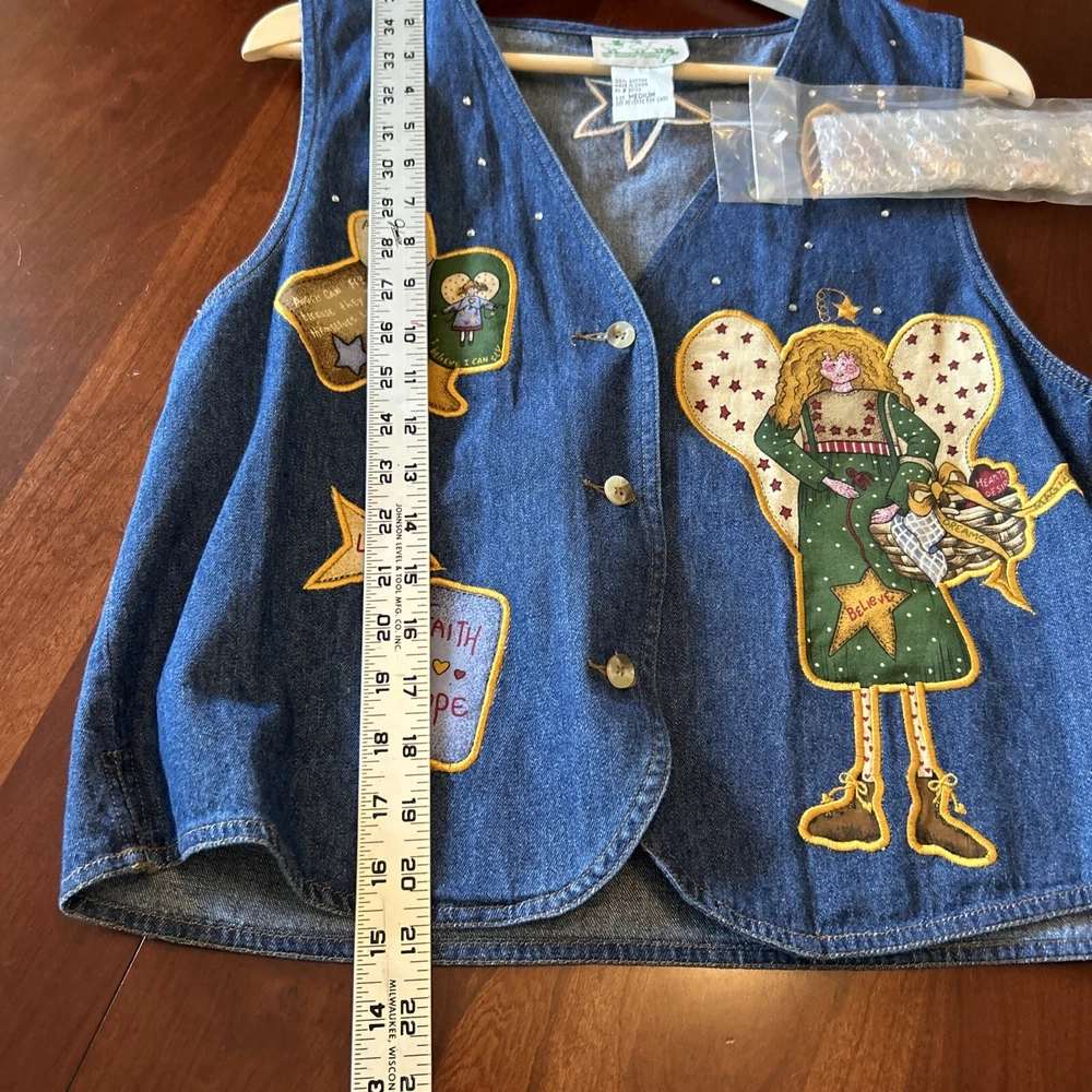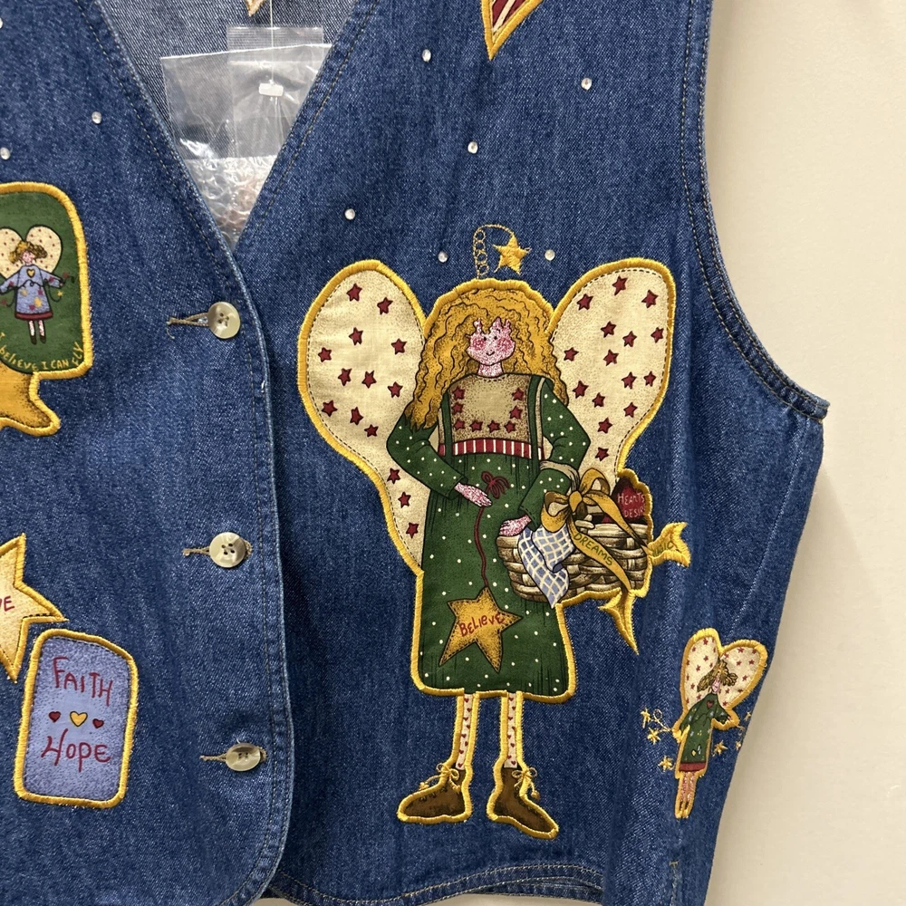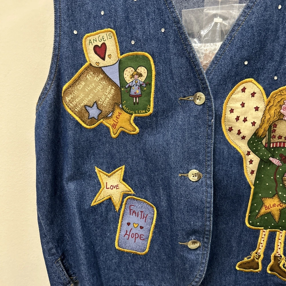 Quacker Factory Jean Vest Jacket M Angel Denim Button Sleeveless Christmas NWOT This Quacker Factory Jean Vest Jacket in size M is a must-have for any fashion-forward woman. The vest features a unique angel and stars pattern, with extra buttons for added style. The outer shell material is made of 100% cotton denim, making it perfect for travel, casual outings, and business meetings. The vest has a button closure and is machine washable for easy care. The sleeveless design and short length make it perfect for layering over a shirt or blouse, while the blue color adds a pop of color to any outfit. The jacket is not only stylish but also has a theme of angels, faith, and love. This vest is perfect for anyone who wants to add a touch of angelic charm to their wardrobe.