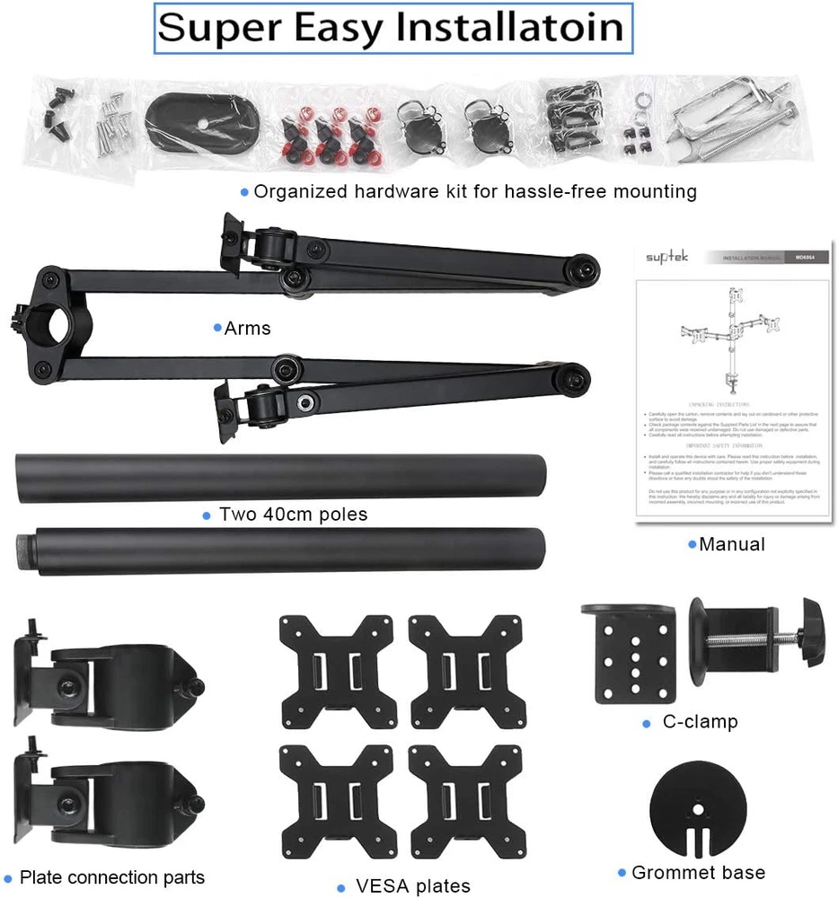 Store New Arrivals Add to Favorite View Feedback Contact Quad LED LCD Monitor Stand up Desk Mount Extra Tall 31.5 Inch Pole Heavy Duty Fully Adjustable Stand for 4 (3+1) / Four Screens up to 27 Inch (MD6864) Description Item model number MD6864 Maximum Compatible Size 27 Inches Mounting Type Tabletop Mount Color 4 (3+1) Quad plates-desk mount-80cm stand Item Weight 15.53 pounds Material Alloy Steel Material Type Alloy Steel Manufacturer Part Number MD6864 Compatible Devices Monitor Movement Type Rotate, Swivel, Tilt Minimum Compatible Size 27 Inches Is Discontinued By Manufacturer No Product Dimensions 21.54 x 9.45 x 3.7 inches Size 4 monitor plates - desk clamp Compatibility - Quad monitor mount ideal for most screens up to 27" (not for three 27"curved monitors in horizontal position) and 22lbs each with 75x75mm or 100x100mm backside mounting holes. Fully aticulation - Rotate 360°, tilt ±90° up and down, swivel ±90° left and right (middle plates tilt ±45° up and down, swivel ±45° left and right), extra tall height adjustment along the center pole. Two install options - C-clamp and optional grommet base (fits desk up to 4" thickness) save your valuable desk space. Integrated cable management - Keeps your desk tidy and clean by organizing your power and AV cables in detachable cable clips. Easy installtion - Step-by-step user manual and organized hardware kit for hassle free mounting. Product Description Monitor Mount/Stand Raise your monitors to optimal height according to your different needs. Ergonomically designed to encourage proper sitting or standing posture to help relieve stress on your neck, shoulder and back. This monitor mount can raise your monitors to an ergonomic eye level position, which helps you adjust your sitting or stand posture to reduce neck and back pain. You can easily adjust your monitors to an optical angle with full motion adjustment. You could also easily share your screens with others. Improve your working and life from now! Four VESA plates, each holds screen with 75mm or 100mm VESA holes. 800mm pole raises your monitor by 800mm high at most. Rotate 360°, tilt ±90° up and down, swivel ±90° left and right, to meet all of your needs (middle plates tilt ±45° up and down, swivel ±45° left and right). Each plate holds screen up to 22lbs, up to 27” size. Integrated cable management and tool holder keeps your desk tidy and clean. C-clamp and optional grommet base save your valuable desk space. Tool holder It is designed to keep your essential tools. If you need to loosen or tighten the arm, you could adjust easily with these tools. Cable Management With integrated cable management, you won't be troubled by messy wires any more. It is specially designed to save more space and ensures an elegant and tidy look. Two Install Options This heavy-duty C-clamp secures to the edge of a desk or table. The portion of the clamp in contact with the top surface of you desk is lined with thin padding to protect the desk surface from scratching. An optional grommet base is included. ABOUT US We offer the best prices around on high quality products. Our E-store includes media such as books, movies, music and games while offering electronics, toys, sporting apparel, clothing, tools, general home, garden items and more. SHIPPING We are always working hard to ensure your package arrives as soon as possible. Please understand that some factors like weather, high postal traffic, and the performance of shipping companies are outside of our control. We offer free shipping to the lower 48 states and ship within 2 business days of payment, usually sooner. We do not accept P.O. Boxes. Please provide a physical address. For shipping outside of the continental USA, we only use eBay's Global Shipping Program.The item is shipped to KY and then sent to the rest of the world. International customers are responsible for all duties and taxes. Continue to check out in order to calculate costs for shipping the item to your country. Messages regarding eBay's Global Shipping Program MUST be directed at eBay EXCLUSIVELY. RETURNS We offer a 30-Day Return Policy on items which you are not completely satisfied with. You have the option for a full-refund or an exchange of the item. No returns are available on items shipped outside of the USA. PAYMENT We accept PayPal. CONTACT US This page content is yet to come Please ad us to your favorite seller and visit again later Thank You CUSTOMER SATISFACTION We try our very best to make sure every customer is completely satisfied. If there's a problem, message us! We're happy to help. WE ACCEPT Copyright © 2021 AutoDS. | All Rights Reserved