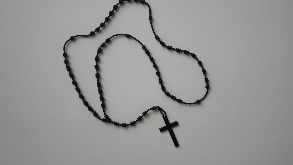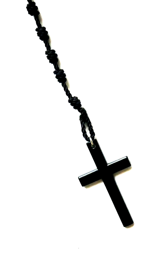 Quality Black Knotted Cord ROSARY with Black Cross and Pouch. SIZE/LENGTH: 20" including the cross. MATERIAL: Made with nylon cord. CROSS: Beautiful black enameled Cross measures 1-7/8" x 1-1/8" Very good quality! NOTE IT CAN BE USED AS A NECKLACE ROSARY Comes with a FREE beautiful black or blue velveteen pouch. Please feel free to email me with questions about this item. Also please check my other listings. I am always available to answer your questions promptly. Buy from us with confidence.