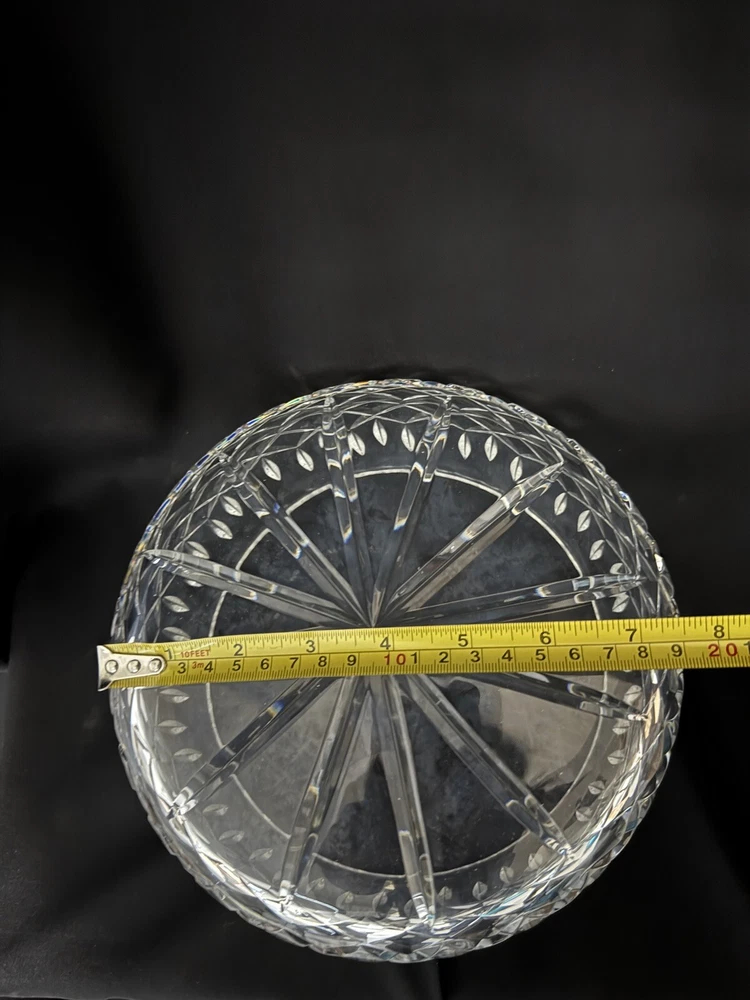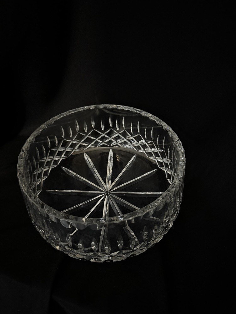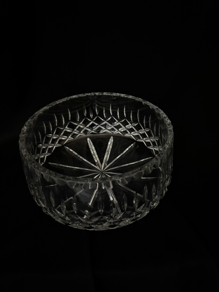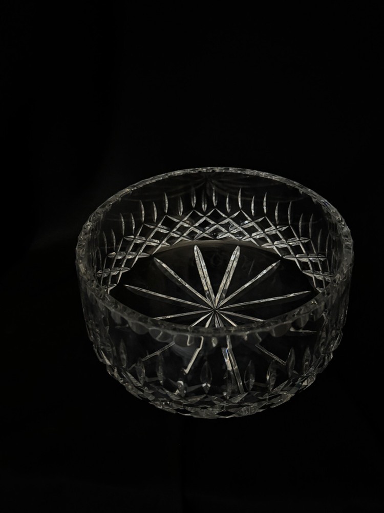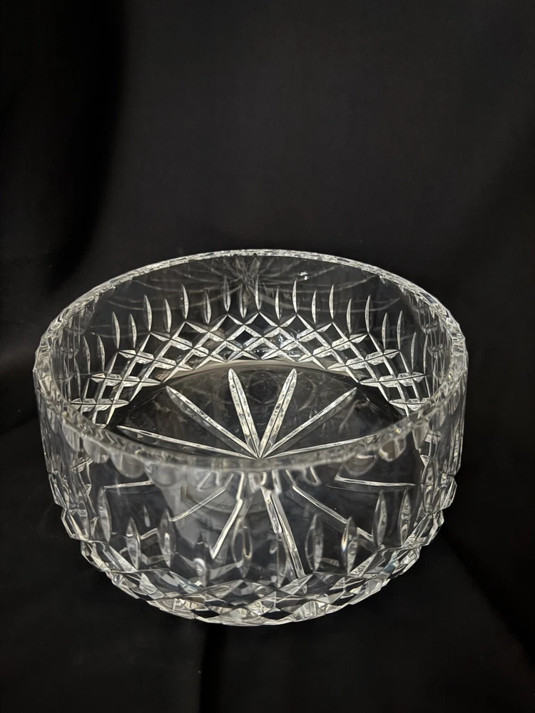 This is a stunning vintage crystal bowl featuring a vertical and criss-cross cut design, making it a luxurious and elegant piece for serving fruits or displaying as a decorative item. The bowl is made of high-quality crystal in a clear color, adding a touch of sophistication to any table setting or home decor. Its contemporary original design and production style showcase the fine craftsmanship and attention to detail that went into creating this beautiful piece.