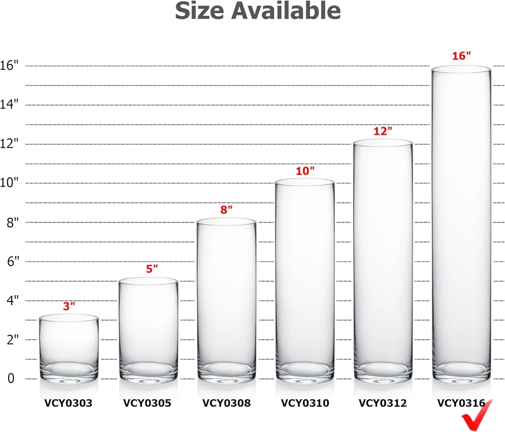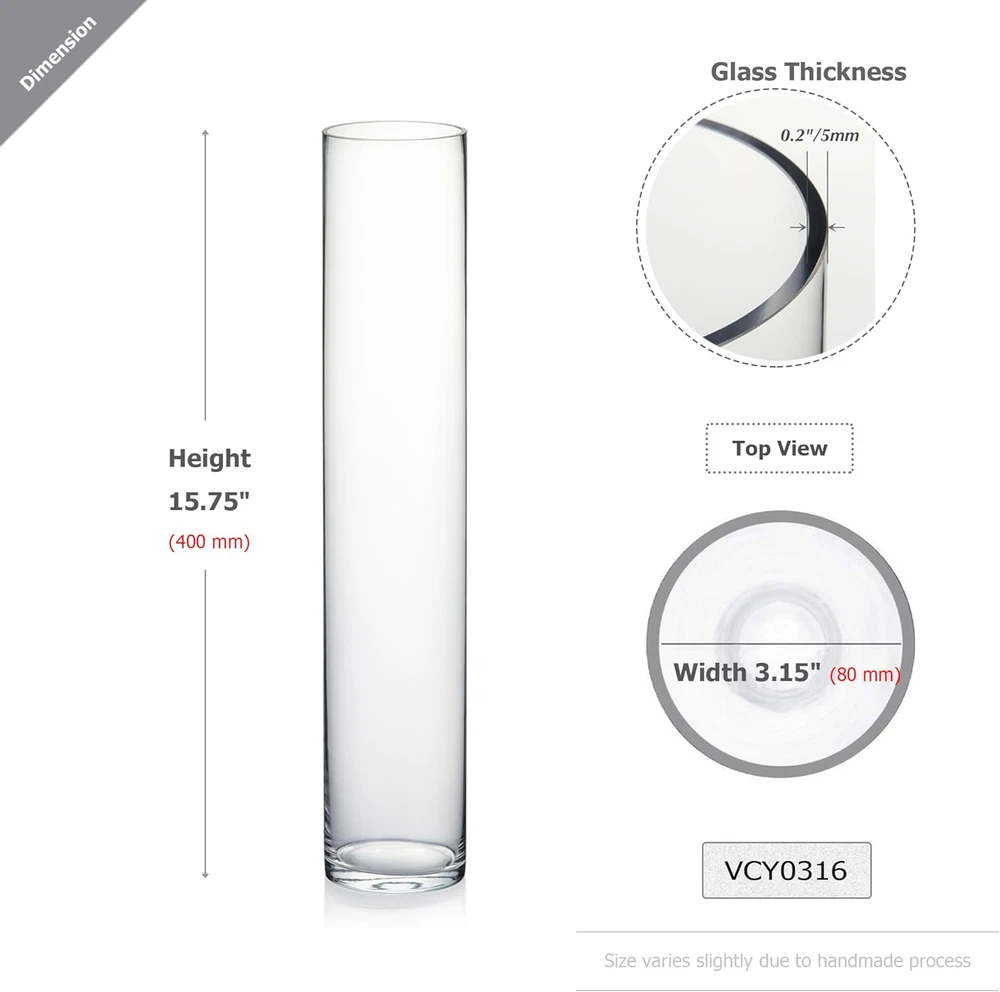 Include: 1 Piece Quality Clear Cylinder Glass Vase Carefully Packaged, Vase Filler and Flowers are Not Included. Size: Width (Diameter): 3.15" (80 mm), Height: 15.75" (400 mm), Thickness about 0.2" varies slightly due to handmade process. Feature - A Piece/Pieces of durable handblown glass vases, well made with thick and durable wall and Base. The cylinder glass vase has a Versatile and timeless design. Quality - Each Vase is meticulously hand-crafted from high-quality, transparent glass, allowing the natural beauty of flowers to shine through and create stunning visual displays. Uses - Floral Arrangement, Flower Vase, Wedding Centerpieces, Floating Candle Holder, Home & Accent Decor, Floral Design, Tabletop, Gift, Storage container, Artistic Display, Terrarium Planters. Product Description VCY0408 Welcome to WGV store! (WGVI: Wholesale Glass Vases International) Our goal is to deliver the greatest variety of pieces to offer our customers with both "High End" and "Regular" quality glass and ceramic containers International team LA warehouse located LA, Dallas & Atlantic Showroom Import from China Customer first What we have? 3"D & 4"D Glass Cylinder Vase Size Available: Width: 3" (Fit up to 2.5" width Candle) Height: 3", 5", 8", 10", 12", 16" Width: 4" (Fit up to 3.5" width Candle) Height: 4", 6", 8", 10", 12", 14", 16", 18", 20", 24", 28" A simple and transparent style glass vase with a bouquet of your favorite flowers, adding a sense of fashion, embellishing your life, and let you have a happy mood every day. 100% handmade glassware skinny cylinder vase/candle holder smooth body curve clear texture home/office decoration event display WGV Quality Glass - Cylinder (3" & 4" D) Cut to perfection, instead of having the cheap looking machine-made glass cylinder vase with the sealed rim on top. Glass thickness about 0.2" (5 mm), varies slightly due to handmade process WGV Quality Glass - Cylinder (3" & 4" D) 100% hand-blown quality thick glass, may contain air bubbles as well as exhibit slight variations and imperfections due to the handcrafting process. The cylinder vases features good glass wall thickness to ensure durability. WGV Quality Glass - Cylinder (3" & 4" D) Our glass cylinder vase collection contains a huge variety of widths and heights of glass cylinder vases that can work with nearly every imaginable design of floral or candle arrangements. There can be no better option if you’re looking for the perfect combination of inexpensive elegance and functionality. WGV Quality Glass - Cylinder (3" & 4" D) Professional packaging Your experience is always our priority. Glass vases are fragile products, please treat it carefully when installed. Note: If you receive item broken, it is not consider defective. Please contact our office immediately for replacement or refund. There is no need for returning broken vases, just simply send us a picture would do. Broken vases are not defectives on the vases; it is caused by carrier damage during transit. Please do not file it on as defective, as may confuse between shipping damage and defectiveness of the product. thick rim quality heavy & thick bottom wide selection well packaging Candle Holder Floral arrangement Planter terrarium & Aquarium Accent light First Use & Extended Care Prior to first use, glass pieces should be hand washed individually in warm soapy water, rinsed thoroughly and dried with a lint free cloth. For optimal finish & clarity, clean with a 50/50 solution of vinegar and water, let stand for a few hours then rinse well and dry with a lint free cloth. Our glass is produced overseas in extremely large quantities for our wholesale customers, due to transit and mass storage, all vases should be cleaned before use to remove any accumulated dust/dirt. Change liquid contents of glass containers frequently. This will help preserve the products finish and avoid film build-up. Glass pieces should not be cleaned in a dish washer. Do not use products in microwaves or conventional ovens.