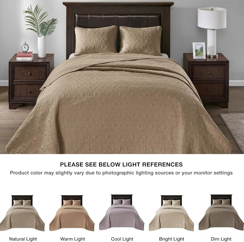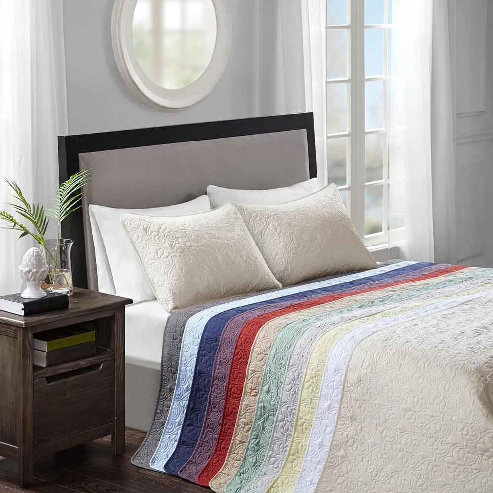 100% Microfiber Face & Reverse, Filling: 90% Cotton, 10% Olefin Madison Park Quebec Reversible Bedspread Set is the perfect classic update to your bedroom décor. Bedspread dimension is oversized to drape better on high depth mattress The classic stitch pattern pairs easily with your existing decor and will sure to add a new decorative element to your bedroom Naturally lightweight fabric perfect for summer use or layer it on for cold weather Set includes: 1 Bedspread: 120"W x 118"L, 2 King Shams: 20"W x 36"L Care instructions: machine washable The Madison Park Quebec Reversible Bedspread Set offers a charming cottage-inspired update to your bedroom. The reversible bedspread and shams (1 in Twin/TwinXL) flaunt a classic stitch pattern that creates a rich depth and texture on the face of the bedding set. Prewashed cotton filling provides added comfort and durability, while the oversized dimensions allow the bedspread to drape better.