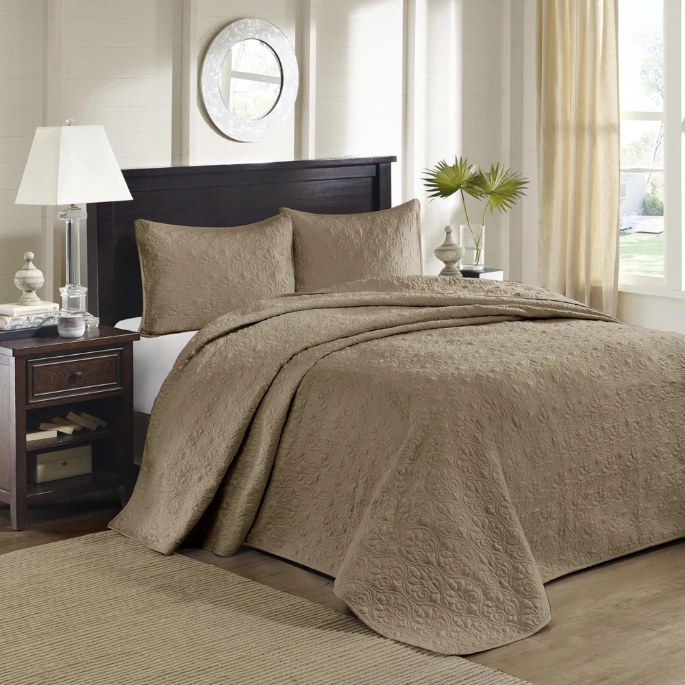 Quebec Reversible Bedspread Set is the perfect classic update to your bedroom décor. Bedspread dimension is oversized to drape better on high depth mattress The classic stitch pattern pairs easily with your existing decor and will sure to add a new decorative element to your bedroom Naturally lightweight fabric perfect for summer use or layer it on for cold weather Set includes: 1 Bedspread: 120"W x 118"L, 2 King Shams: 20"W x 36"L Care instructions: machine washable