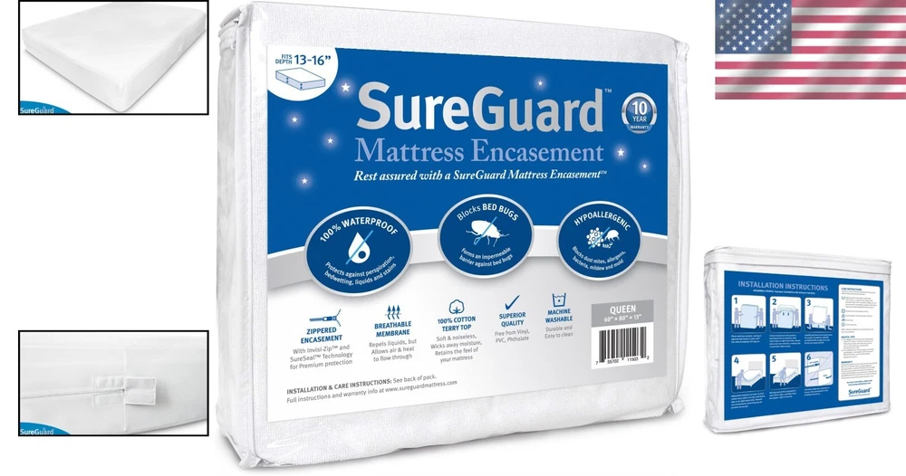 Batteries Required: No Water Resistance Level: Waterproof Department: Adults, Kids, Teens, Unisex Baby & Toddler Room: Bedroom Color: White Closure Type: Zip Product Dimensions: 80 X 60 X 13 Inches Item Length: Waterproof Mattress Encasement Features: Waterproof, Bed Bug Proof, Hypoallergenic, Machine Washable, Zippered Fabric Type: Premium Cotton Terry Material Type: 13-16" Deep Product Care Instructions: Machine Wash Material: Cotton, Premium Cotton Terry UPC: Does Not Apply Age Range (description): All Ages Brand: Unbranded Type: Mattress Encasement Care Instructions: Machine Wash Size: Queen gtin13: Does Not Apply Item Weight: 3.3 Pounds Item Width: Waterproof Mattress Encasement