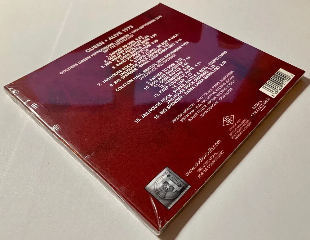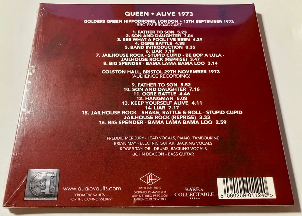 Artist - Queen Title - Alive 1973 Rare and collectable recordings - digitally remastered. Classic concert recordings from 1973, recorded in London & Bristol. Brand New CD (sealed) Track Listing 1. Father To Son 5.23 2. Son And Daughter 7.06 3. See What A Fool I've Been 4.39 4. Ogre Battle 4.38 5. Band Introduction .35 6. Liar 7.19 7. Jailhouse Rock - Stupid Cupid - Be Bop A Lula - Jailhouse Rock (Reprise) 3.47 8. Big Spender - Bama Lama Bama Loo 3.14 Colston Hall, Bristol 29th November 1973 (Audience Recording) 9. Father To Son 5.52 10. Son And Daughter 7.16 11. Ogre Battle 4.46 12. Hangman 6.08 13. Keep Yourself Alive 4.11 14. Liar 7.17 15. Jailhouse Rock - Shake, Rattle & Roll - Stupid Cupid - Jailhouse Rock (Reprise) 3.33 16. Big Spender - Bama Lama Bama Loo 2.59 100% Original Product