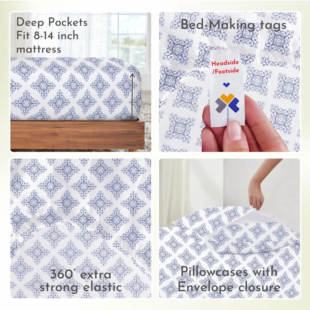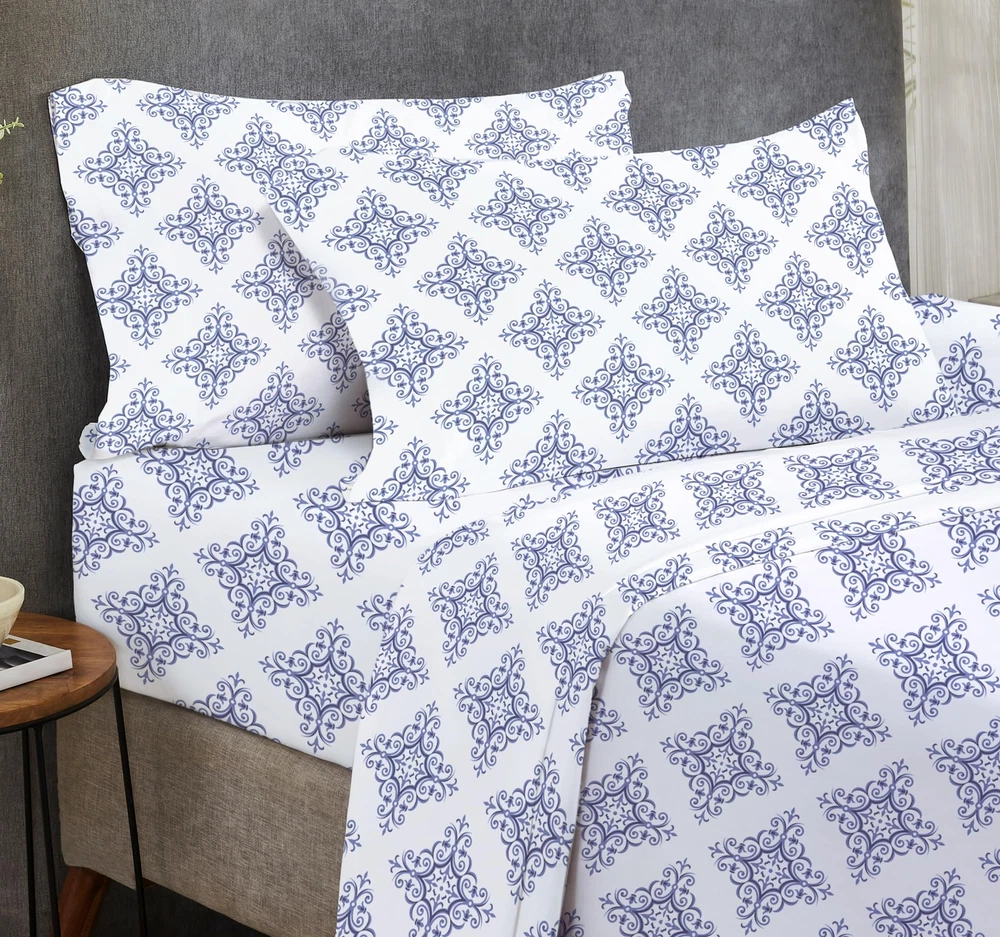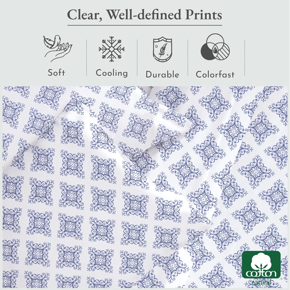 Discover the perfect blend of style and comfort with our printed sheet sets. If you're looking to add a pop of personality to your bedding, our 100% cotton sateen printed sheet sets are the perfect solution! Not only are these sheets incredibly comfortable, but the clear and well-defined prints allow you to express your personal style in a subtle yet impactful way. We believe that bedding should be both stylish and practical, which is why our printed sheets meet the highest standards of quality and durability. The naturally luxurious and soft fabric provides a comfortable night's sleep, while the vibrant, long-lasting colors resist fading with washing. Crafted from the finest sateen cotton, our printed sheet sets feature exceptional print quality. The tight weave of the fabric creates an ideal canvas for beautiful, balanced prints without any misprints or loud patterns. Our 4-piece printed sheet sets for Queen, King, and California King come with 14-inch deep pockets, fitting mattresses from 8 to 14 inches deep. The 3-piece printed sheet sets for Twin and Twin XL come with 12-inch deep pockets, fitting mattresses from 8 to 12 inches deep. The strong, secure elastic ensures that your sheets stay in place throughout the night, maintaining their fit even after years of use. Elevate your bedding with our printed sheets, featuring a variety of fun florals and stripes. Showcase your personality and add a pop of color to your bedroom with these stylish and practical sheet sets. TIMELESS ELEGANCE, COZY COMFORT: Luxuriate in our 100% cotton Soft 100% Cotton Sateen printed filigree sheet set. Premium long staple cotton ensures lasting softness. Vibrant colors endure wash after wash. Reminiscent of traditional craftsmanship, the intricate filigree pattern adds exquisite charm to your bedroom aesthetic. CRAFTED TO FIT: Our 4-piece queen bed sheets set boasts quality stitching and 14-inch deep pockets, accommodating mattresses from 8-14 inches deep. Pillowcases feature envelope closure for a tidy appearance. The fitted sheet of this queen sheet set deep pocket has all-around elastic and a head side / foot side indicator for effortless bed-making. DURABLE & LOW MAINTENANCE: Our cooling sheets for hot sleepers are machine washable and dryable at a normal setting, maintaining their quality for years. With no linting, wrinkles, or pilling, these deep-pocket queen sheets retain their color and size wash after wash. PERSONALIZED COMFORT & WELL-BEING: Upgrade your bedroom decor effortlessly with our 100% cotton sheet set, featuring classic stripes to chic florals. Crafted from long staple cotton, each set ensures comfort and well-being. OUR COMMITMENT: In 2022 & 2023, we donated over 22,000 pieces of bedding to local charities in USA. Our packaging is plastic-free, and our sheets are crafted in our family-owned factory in India. We ensure quality and provide a hassle-free 30-day return policy, even for used products.