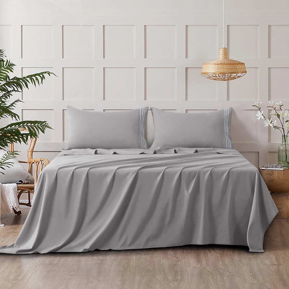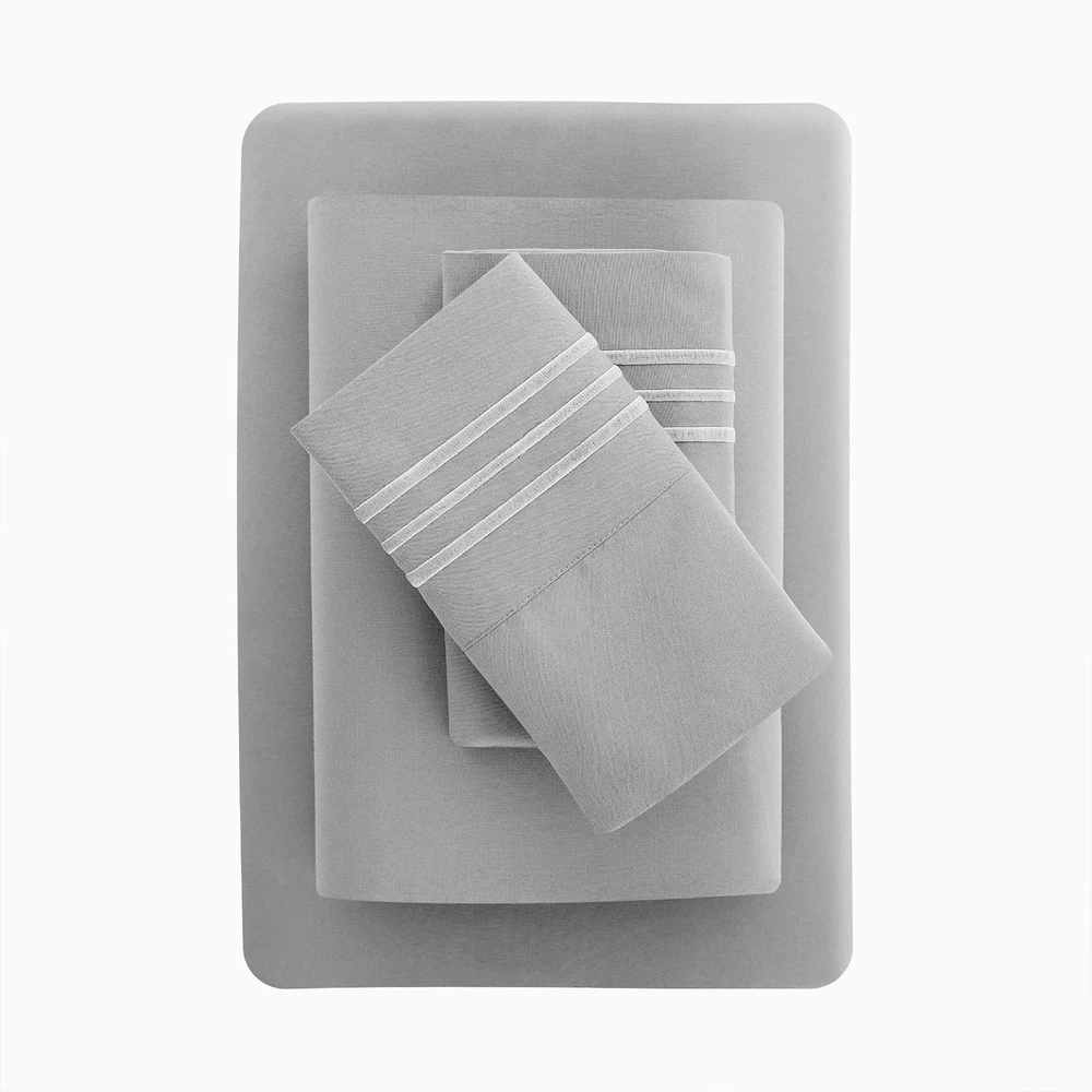 Triple Line Embroidered Bedding Sheets: Each pillowcase is embroidered with three classic marrow lines which brings your bed elegant simplicity. The envelope-style pillow cases can keep the pillow secured inside 5 Star Hotel Bedding Experience: Extra soft brushed microfiber makes up the luxuriously silky sheets, offering you 5-star hotel experience at home. Sleep better and wake up each morning feeling refreshed and full of energy Highest Quality Microfiber: This queen sheet set uses premium ultra-soft double-brushed microfiber crafted for softness and breathability. The sheets for queen size bed are composed of microfiber that balances breathability and an insulating feel. This silky, supple material is exceptionally soft to the touch. The sheet set resists wrinkles, so the sheets are smooth right out of the dryer without any ironing Queen Size Soft 4 Pieces Bed Sheet Sets with Deep Pocket: 1 piece 90"x102" flat sheet , 1 piece 60"x80" fitted sheet , 2 pieces 20"x30" pillowcases. The standard bottom sheet works with mattresses up to 16 inches deep, with elastic all the way around for a secure fit Satisfactory Service: As your satisfaction is of the utmost importance to us. is committed to offering you premium products and a caring service. Please feel free to us if you have any questions about our products. We would try our best to solve problems as soon as possible
