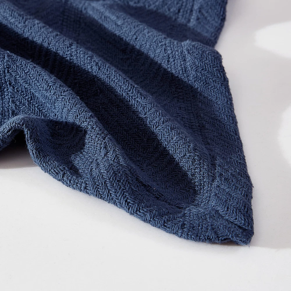 A herringbone stripe weave makes this all cotton solid color Blanket something special. The handsome tonal texture adds subtle style and the rich Navy color makes a strong statement whether used alone or as a lightweight layering piece on your bed. INCLUDES: (1) full/queen blanket MATERIAL: 100% Cotton FEATURES: Herringbone weave stitch and hemmed on all sides. Light-weight and durable for long lasting, year round use DIMENSIONS: 90" x 90" CARE INSTRUCTIONS: Machine washable for easy care. Machine wash cold, separately. Delicate cycle. Tumble dry low. Do not bleach. Please note 100% Cotton Blankets will produce lint over the first few launderings, this is normal and does not take away from the quality of the blanket