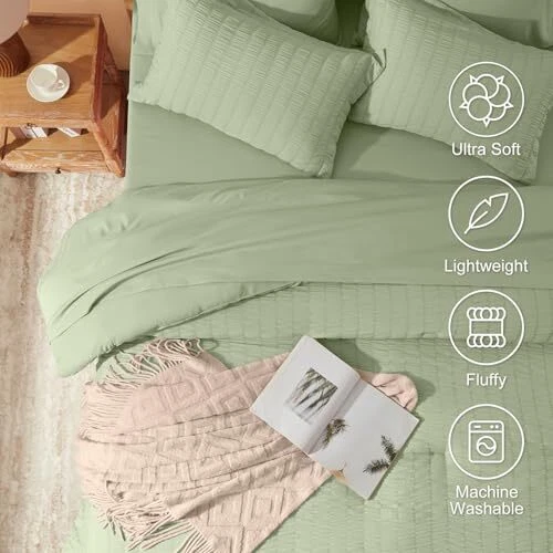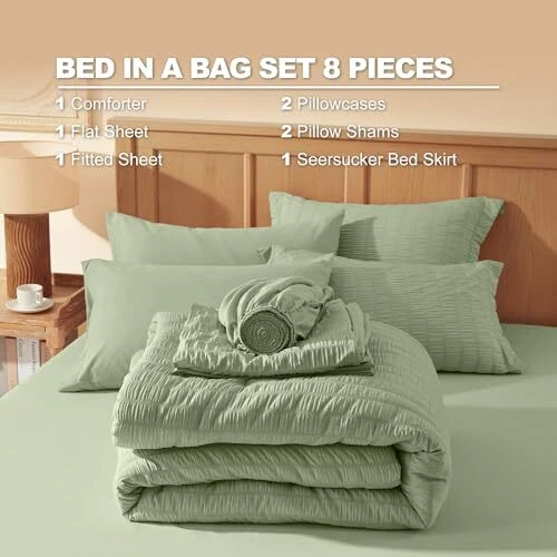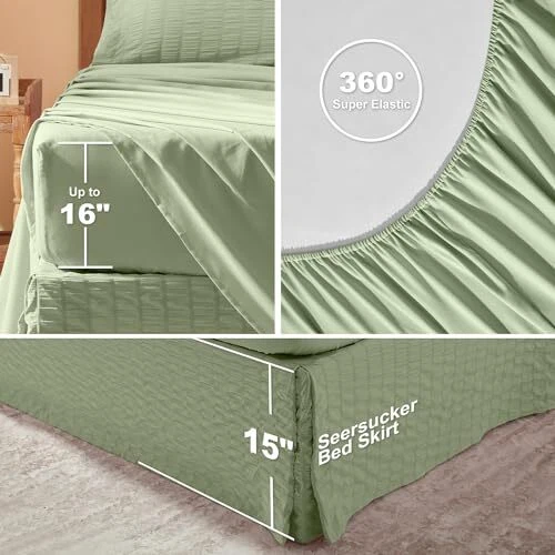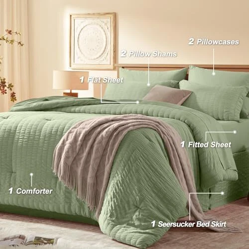 Return Policy Fast Delivery Trusted seller Queen Comforter Set 8 Pieces, Seersucker Bed in a Bag Queen, Sage Green Comforter with Sheets, Comforters Queen Size Bedding Sets with Comforter, Sheets, Pillowcase & Sham and Bed Skirt Product Description 【So Soft, So Lightweight, So Warm】 Our queen comforter set and seersucker bed skirt is made of premium microfiber fabric, very cozy and soft. The comforter is made with excellent 240gsm cloud-like down alternative filling, which never bunched up after washes. It is lightweight and will not make you sweat on hot nights and is warm enough for cold nights, So you will totally love this comforter set for all seasons! 【Chic Seersucker Design】 This queen size comforter set is designed with textured seersucker, slightly pleated to bring vivid and three-dimensional wave visual effect, adding a sense of romance to your bedroom. Whether it's Mother's Day, Women's Day, Christmas, or just to show you care, give this elegant and cozy gift to your loved ones. 【Easy Care, Save Your Time】 The bedding comforter sets are machine washable which can save you more time and energy. For year round softness and prevent pilling up, it's highly recommend to wash it in the gentle cycle with cold water, sun-dry or tumble dry in low when needed. Let our comforter and sheets keep providing you and your family with cozy sleeping! 【Value Bedding Set】 8 Pcs Bed in a Bag Queen includes 1 comforter (88"x 88"), 1 flat sheet (90"x 102"), 1 fitted sheet (60"x 80"+14"), 1 Seersucker Bed Skirt (60" x80"+15"), 2 pillowcases (20"x 30") and 2 pillow shams (20"x 26"). Tips: Our queen bed set is vacuum packaged, it is highly recommended to wash it and tumble dry low temperature to puff the comforter before first use. Or you can expose it to sunlight and tap gently, then it will re-fluffed nicely after hours. 【Satisfactory Service】 We are committed to providing you high quality comforter sets and a caring service. If you have any problem about our products, please feel free to contact us for an exchange or refund. We will provide you 1-Month return and replacement service & life-time free customer service. Shipping Returns Payment Shipping Shipping is FREE to all addresses other than APO/PO boxes in the lower 48 states. All our stock ships from US-based warehouses. Shipped via USPS or UPS (depending on location and package weight) Unless stated otherwise, all orders will ship within 24-72 hours of your payment being processed. Check our feedback to see the great reviews of FAST shipping we offer. Returns Seller does not accept returns Payment We currently accept payment via eBay managed payments only. Once payment is cleared, we will dispatch your shipment within 1-3 business days. Please refer to the "Shipping" tab for more information regarding shipping speed to your destination.