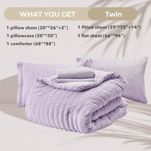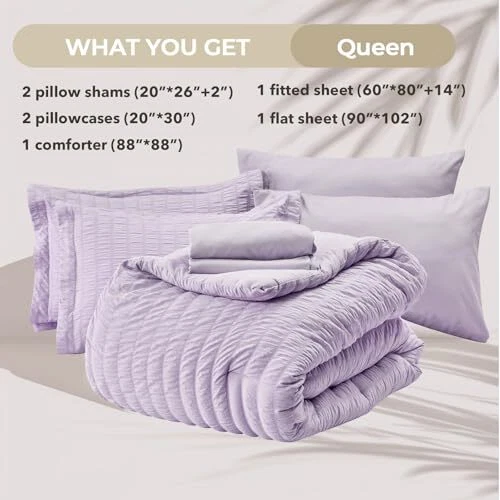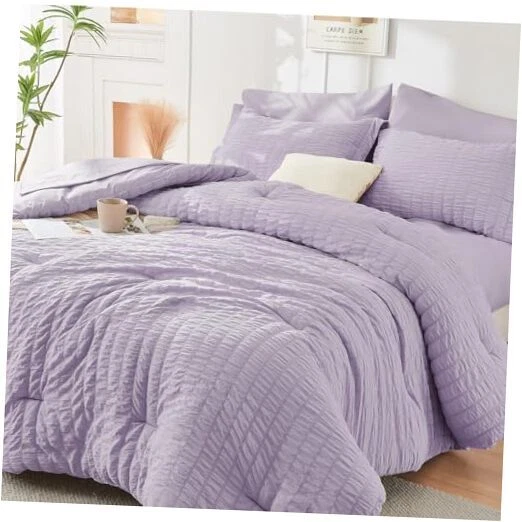 Return Policy Fast Delivery Trusted seller Lavender Queen Comforter Set Seersucker 7 Pieces, All Season Luxury Bed in a Bag for Bedroom, Bedding Set with Comforters, Sheets, Pillowcases & Shams Product Description Certified Safe Fabric: This queen comforter set is certified by OEKO-TEX Standard 100, ensuring it meets high safety standards and is free from harmful substances; made from soft microfiber, the interior is filled with premium 240 GSM microfiber, providing a cloud-like sleeping experience suitable for all seasons Anti-Wrinkle Textured Design: Unlike traditional, plain duvet covers, our slightly pleated seersucker texture is both beautiful and delicate; creates a vivid three-dimensional wavy pattern; the striped texture enhances this design, which is wrinkle-resistant and easy to care for; the gentle seersucker queen bedding set adds a unique sense of romance and elegance to your room Deep Pocket Fitted Sheet: Our stretchy deep-pocket fitted sheet easily fits any 12-15 inch mattress and stays in place no matter how you toss and turn; the soft brushed microfiber fabric provides just the right amount of warmth and comfort What's Included: The queen size bed set includes 1 Comforter (88" x 88"), 2 Pillowcases (20" x 30"), 2 Pillow Shams (20" x 26"), 1 Fitted Sheet (60" x 80" x 14"), and 1 Flat Sheet (90" x 102"); the set is packed in a vacuum bag; simply dry on low heat or gently fluff under the sun to restore its loft Easy Care: Our bed in a bag set is easy to care for; simply machine wash in cold water; if you have any questions or concerns, our customer service team is to help Shipping Returns Payment Shipping Shipping is FREE to all addresses other than APO/PO boxes in the lower 48 states. All our stock ships from US-based warehouses. Shipped via USPS or UPS (depending on location and package weight) Unless stated otherwise, all orders will ship within 24-72 hours of your payment being processed. Check our feedback to see the great reviews of FAST shipping we offer. Returns Seller does not accept returns Payment We currently accept payment via eBay managed payments only. Once payment is cleared, we will dispatch your shipment within 1-3 business days. Please refer to the "Shipping" tab for more information regarding shipping speed to your destination.