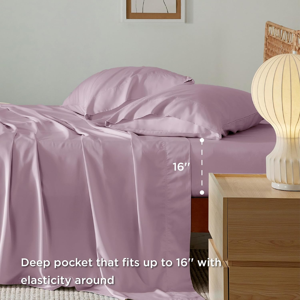 Item dimensions L x W x H: 13.66 x 11.14 x 3.58 inches Closure Type: Envelope Product Care Instructions: Do Not Bleach, Please quickly remove any stains to prevent perman Weave Type: Twill Size: Queen Fitted Sheet Pocket Depth: 16 Inches MPN: Not Applicable Pattern: Solid Thread Count: 250 Item Weight: 4.82 pounds Color: 18 - Lavender Style: Modern Material: Rayon Derived from Bamboo Pillowcase Quantity: 2 Manufacturer: Bedshe ISBN: Not Applicable Unit Count: 1.0 Count Included Components: 1 Flat Sheet (90" x 102"), 1 Fitted Sheet (60" x 80"), 2 Pillowca Brand: Bedsure Product Dimensions: 13.66 x 11.14 x 3.58 inches UPC: 691162895803 gtin13: 0691162895803 EAN: 0691162895803 Special Feature: Soft & Silky Theme: Solid Age Range (Description): Adult Number of Pieces: 4 Occasion: Wedding Seasons: All Type: Not Applicable
