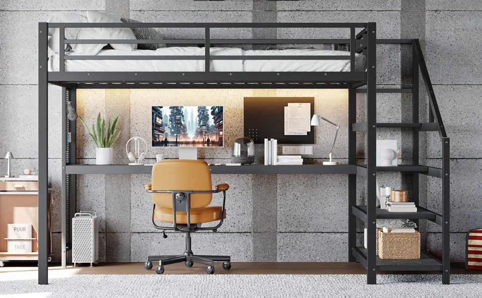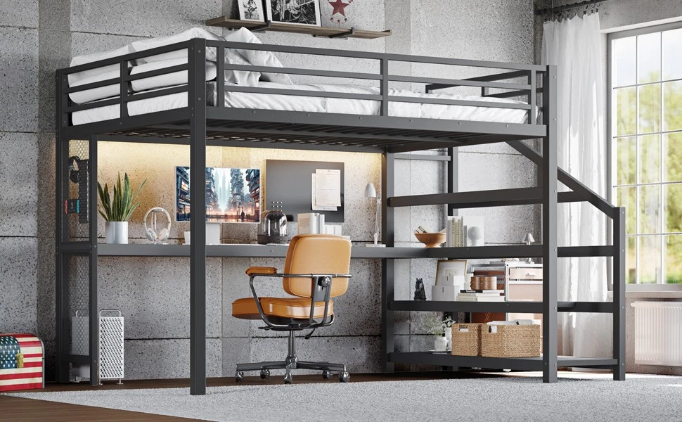 Queen Loft Bed with Desk and Storage Stairs, Metal Loft Beds with LED Lights Features 【Space-Saving & Functional Design】This queen loft bed with desk and storage stairs maximizes your room by combining a built-in desk, shelves, and sturdy stairs. The unique iron nets let you hang photos, calendars, or small items, making your space practical and personalized. 【LED Lights & USB Ports】Equipped with built-in LED lights and convenient USB ports, this queen loft bed with storage creates a cozy atmosphere and keeps your devices powered. It’s perfect for studying, working, or relaxing in style and comfort. 【Durable Metal Frame】Crafted from premium steel with a rust-resistant finish, this queen loft bed frame provides reliable stability and long-lasting use. The solid construction ensures both safety and durability for daily living. 【Noise-Free Experience】Designed with noise-reducing rubber plugs, this queen loft bed minimizes squeaks and friction, ensuring quiet and restful sleep every night. Ideal for those who value comfort and peace. 【Easy Assembly】All parts are clearly labeled and come with detailed illustrated instructions and a complete tool kit. This queen loft bed with desk and storage stairs can be assembled quickly and securely without hassle. Descriptions Description Upgrade your bedroom with this Queen Loft Bed with Desk and Storage Stairs, a multifunctional solution for modern living. Its space-saving design combines a built-in desk, shelves, and storage stairs, while the unique iron nets add a personal touch by allowing you to hang photos, notes, or accessories. Built-in LED lights and USB ports enhance convenience, creating a cozy and tech-friendly environment for studying, working, or relaxing. Crafted from heavy-duty steel with a rust-resistant finish, this loft bed frame ensures long-lasting stability and safety. Rubber plugs reduce noise for a peaceful sleep, while the detailed illustrated instructions and included tool kit make assembly easy. Perfect for apartments, dorms, or family homes, this loft bed blends practicality, durability, and style to meet your everyday needs. Weight & Dimensions Product Type Metal Loft Bed Color Black Size Queen Material Metal+MDF Overall Product Dimension 98.5”L*60.5’’W*65”H Overall Product Weight 147.27 LBS Weight Capacity 500LBS for Upper Bed Recommend Mattress Thickness 6'' Number of Package 2 Package Dimension & Weight Please refer to the Specification Level of Assembly Full Assembly Needed Eligible for Hardware Packs Yes Country of Origin China Note All the pictures are taken by actual samples, slight chromatic aberration may occur due to lighting or display.