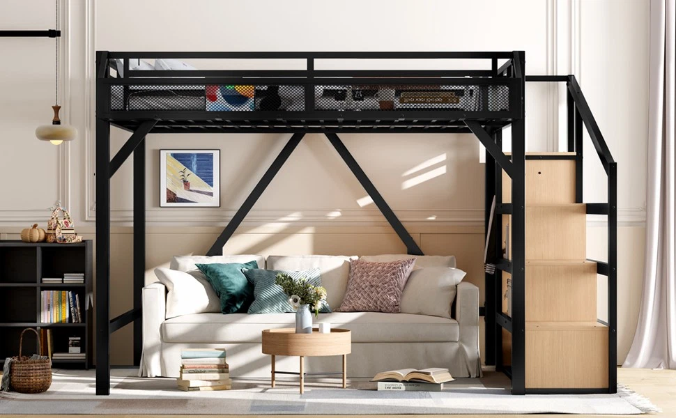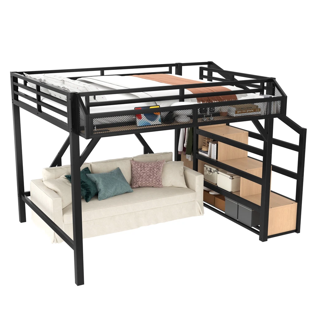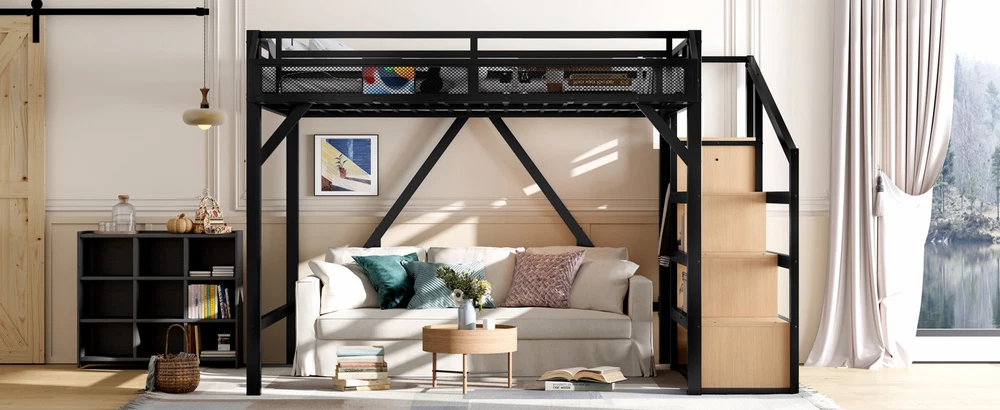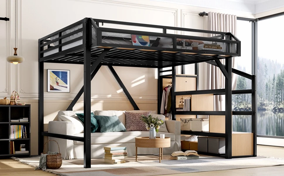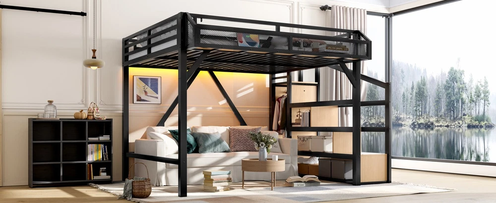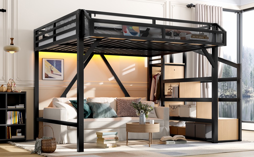 Queen Loft Bed with Storage Stairs, Shelves & Built-in Wardrobe, Metal Loft Bed Features 【Maximized Storage with Built-in Wardrobe & Shelves】This queen loft bed with storage is designed for organization and function. It includes a built-in wardrobe, open shelving, and storage stairs — perfect for storing clothes, books, toys, or essentials while saving space in your bedroom. 【Convenient USB Ports & LED Light Strip Included】More than just a bed — this metal loft bed features built-in USB ports and LED lighting, making it ideal for late-night reading, studying, or charging devices without leaving your bed. A great choice for teens, students, or dorm living. 【Safe Climb Design with Full-Length Guardrails】Stay secure with full-length guardrails on the top bunk and sturdy stairs that double as storage. This loft bed with stairs offers both safe access and added functionality, giving you peace of mind for older kids or young adults. 【Sturdy Metal Frame with Noise-Reducing Structure】Crafted with a heavy-duty metal frame, this queen loft bed is reinforced with premium hardware for durability and stability. Special noise-reducing connectors help minimize squeaking, offering a smoother, quieter sleeping experience. 【Easy Assembly with Complete Kit Included】This space-saving loft bed includes all necessary tools and a detailed illustrated manual for hassle-free setup. Whether you’re a DIY beginner or experienced, you can assemble it confidently and quickly without professional help. Descriptions Description Upgrade your bedroom with this all-in-one Queen Loft Bed with Storage and Built-in Features, designed to maximize space while offering convenience, safety, and style. Ideal for teens, students, or anyone in need of vertical storage, this space-saving loft bed turns your sleeping area into a multifunctional living solution. Built with a durable metal frame, this loft bed features a smart layout that includes storage stairs, open shelves, and a built-in wardrobe — perfect for organizing clothes, books, toys, and essentials without taking up extra room. It’s a complete storage solution built right into your bed. Designed for modern living, the bed comes equipped with USB charging ports and LED strip lighting, making it easy to charge your devices or read at night without needing extra furniture or cords. Convenience and style come together in one streamlined setup. Weight & Dimensions Product Type Metal Loft Bed Color Natural Wood Size Queen Material Metal+MDF Overall Product Dimension 96.85”L*62.9’W*63.39”H Overall Product Weight 164.24 LBS Weight Capacity 350LBS Recommend Mattress Thickness 6'' Number of Package 2 Package Dimension & Weight Please refer to the Specification Level of Assembly Full Assembly Needed Eligible for Hardware Packs Yes Country of Origin China Note All the pictures are taken by actual samples, slight chromatic aberration may occur due to lighting or display.