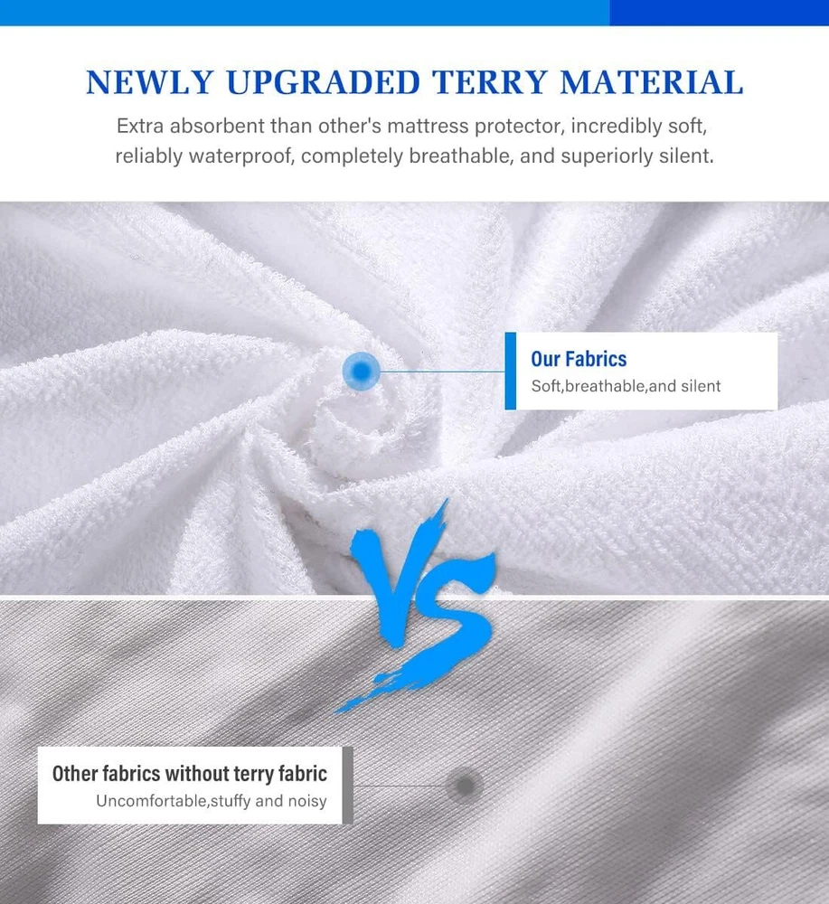 Queen Mattress Protector,Mattress Cover Queen Size Bed, Waterproof Mattress Protector Queen Size Noiseless Queen Mattress Cover Soft Breathable Terry for Pets Kids Adults 60" x 80" Special Feature Water Proof, Washable, Breathable Polyester 【Waterproof & Breathable 】Our mattress protector has an impermeable TPU backing that protects the top of the mattress. Mattress cover protects against perspiration, urine, liquids, and stains; prolonging the life of your mattress. The noiseless waterproof backing allows body heat and air to flow through, keeping your mattress cool and dry. 【Noiseless & Comfortable 】The terry surface allows air and heat to pass through, ensuring softness and great breathability. The specially designed waterproof TPU membrane is made of quality elastic material that is ultra-soft and flexible, and will not cause the rubbery, swishing sounds that other mattress protectors may do. 【Deep Pocket Design 】The highly elastic skirt (around 360°) is made of mesh fabric and has excellent ductility to accommodate 14"-18" high mattresses, making it ideal for most mattresses. 【360°Elastic Band】The 360° fully surrounding elastic banding not only provides full protection for the top and sides of the mattress but also ensures that it will offer a perfect fit while being very easy to remove off and wash. 【The Perfect Gift Choice 】Our mattress covers provide a more comfortable sleeping environment for you and your family. It's a perfect choice for those who have toddlers, kids, pregnant women, pets, or elderly people suffering from incontinence.
