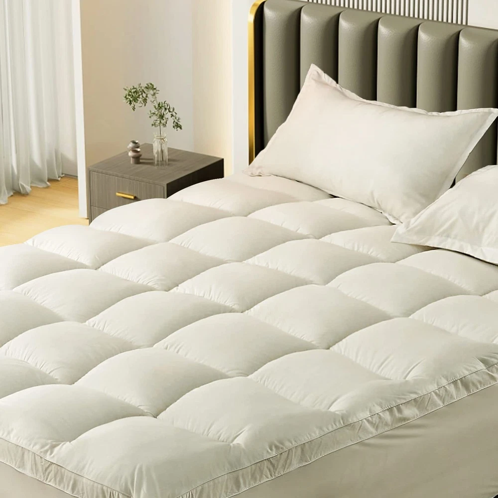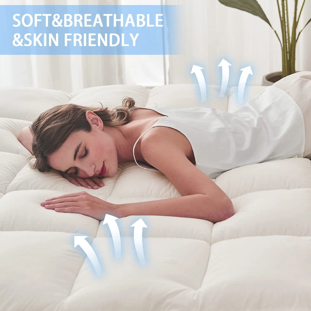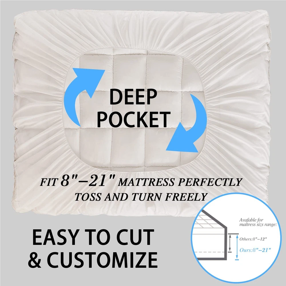 Queen Mattress Topper Cover Cooling Mattress Pad Pillow Top Mattress Cover Quilted Fitted Mattress Protector with 8-21 Inch Deep Pocket ENJOYING SLEEP: Enjoy this cloud-like mattress topper with the overfilled plush luxury down alternative fill, which exhibits a soft and fluffy loftiness for the existing mattress, provides ultra comfort for all sleeping positions. COOLING & BREATHABLE:Made of carefully selected the fabric is breathable, quick dry and shrink-resistant, a durable and smart choice for you. Processed with Peach skin finish, it brings a cozy feeling to touch, also wicks moisture, keeps your skin dry and cool. No more sweaty nights caused by memory foam or traditional mattresses. DEEP POCKET: Deep pocket with 360°all-around elastic skirt perfectly fits and grips any mattress up to 21", so the pillow top will stay in place and you can toss and turn freely during the sleepy nights. The mattress pad is suitable for a wider range of size, no more worry about the pillow top is not enough to wrap, unstable, and easy to run. EASY TO CARE: The mattress topper packaged in a vacuum bag, please spread it for a few days before use so the feather bed topper would return to normal thickness. (Best Way Fluffy Again: Put mattress topper in a tumble dryer on low heat & low speed for 15 minutes, or lay It in the Sun for a Few Hours.) OUR COMMITMENT:Mattress Topper pad is tested to be safe from 300+ harmful chemicals. Rest assured, if you're not happy with our mattress toppers, write to us and we will resolve your query within 1 business day.