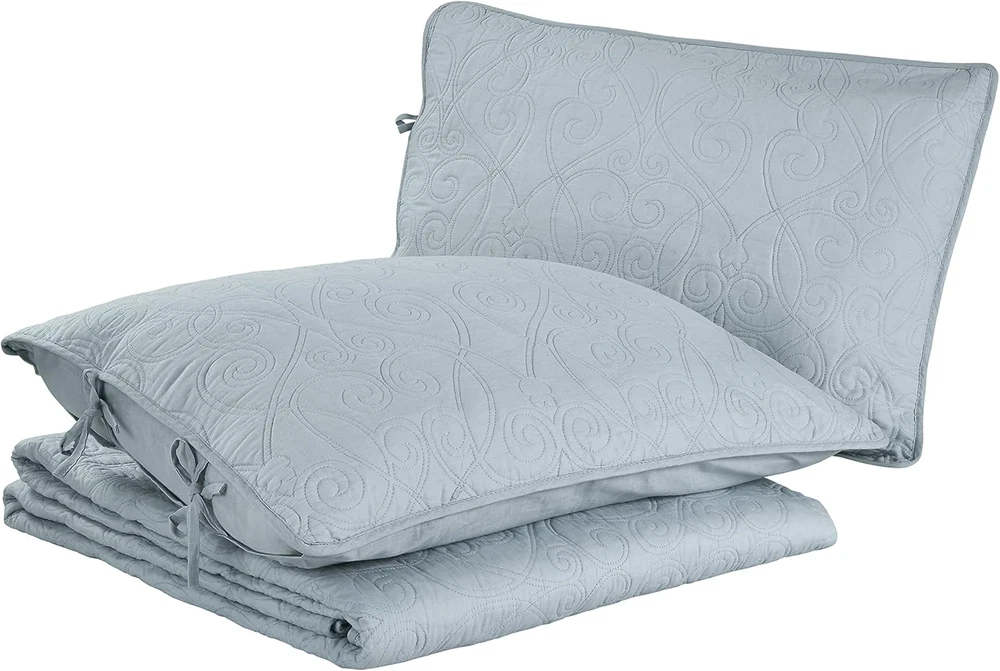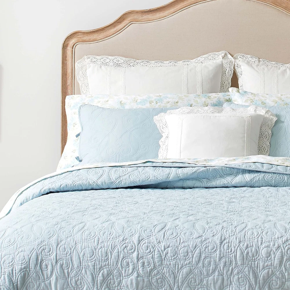 Menu Other Items Feedbacks About Us Contact Us Add To Favorites - Queen Quilt Set, Reversible Cotton Bedding with Matching Shams, Medium-Weight for Year round Use, Pre-Washed for Added Softness (Felicity Blue) 100% Cotton Imported LAURA ASHLEY HOME: Elegantly designed bedding collections inspired by classic British heritage. Our products seamlessly blend beauty and comfort to bring a touch of sophistication to your home every day. QUALITY: Crafted from premium 100% cotton fibers for breathable, durable, and ultra-soft fabric that ensures lasting comfort and quality. EASY CARE: Machine wash cold with gentle detergent, tumble dry low or air dry to maintain softness and prevent shrinkage. SIZE: Queen Quilt- 90"W x 90"L, Standard Shams- 21"L x 27"W FEATURES: Matching shams feature a stylish back envelope closure for a clean, secure fit and easy pillow insertion—adds a polished, cohesive look to your bedding set. Product description The video showcases the product in use. The video guides you through product setup. The video compares multiple products. The video shows the product being unpacked. Laura Ashley Quilts Merchant Video Layer in Comfort and Style with Thoughtfully Curated Bedding Feel Soft, smooth, and inviting, with a gentle handfeel Feel Relaxed and breathable, designed to move naturally and layer beautifully Feel Crisp, smooth, and cool to the touch with a light, breathable feel. Design Graceful and understated, bringing heritage-inspired style to any space Design Features a stunning light blue pinstripe ruffled design Design Clean, classic percale styling for a fresh, polished bed look. Fabrication Made from a high-quality blend of 55% Ramie and 45% Cotton Fabrication Crafted from pure cotton for a soft, comfortable feel with a luxurious touch. Fabrication Made from pure cotton for breathable comfort with a fresh, crisp finish. Care Machine wash cold on gentle cycle with mild detergent Care Machine wash cold, tumble dry on low for lasting softness Care Machine wash cold with like colors on a gentle cycle Item Specification Item model number 210427 Style Farmhouse Assembly required No Pattern Solid Theme Floral Department unisex-adult Import Imported Number of Pieces 3 Batteries required No Product Dimensions 90 x 90 x 0.25 inches Material Cotton Seasons All Is Discontinued By Manufacturer No Included Components One quilt and two standard shams Item dimensions L x W x H 90 x 90 x 0.25 inches Fabric Type 100% Cotton Item Weight 1 pounds Color Felicity Blue Global Trade Identification Number 00883893382015 Refill Cotton Product Care Instructions Machine Wash Size Queen FREE SHIPPING We are always working hard to ensure your package arrives as soon as possible. Please understand that some factors like weather, high postal traffic, and the performance of shipping companies are outside of our control. We offer free shipping to the lower 48 states. We do not accept P.O. Boxes. Please provide a physical address. If you have a problem or question regarding your transaction please contact us immediately. We will work with you to resolve any problem you may have. Thank you