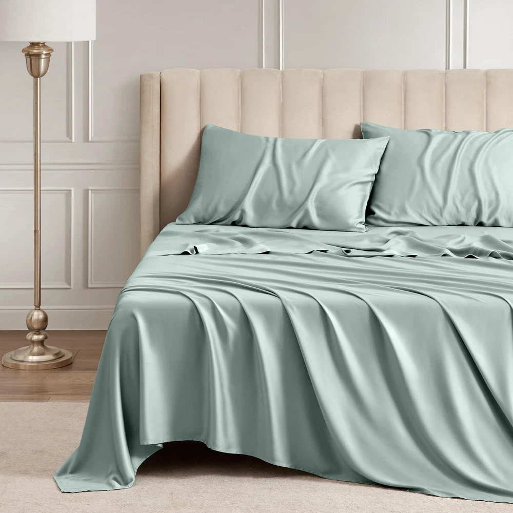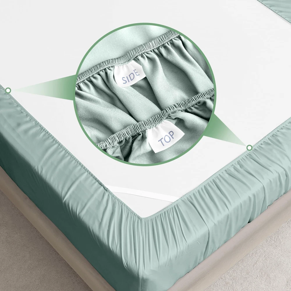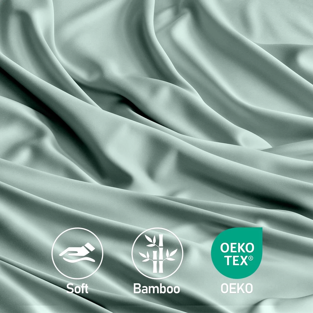 4 Piece Queen Sheet Set: Includes 1 deep pocket fitted sheet(60x80 IN), 1silky sateen weave sheets flat sheet(90x102 IN) and 2 envelope-style pillowcases(20x30 IN) with overlapping closure Cool & Breathable: Rayon Derived from Bamboo sheets have natural heat dissipation and a cool and comfortable surface. Using advanced breathable weaving technology, the unique mesh structure allows air to flow freely between the sheets and the body, helping to quickly dissipate heat, regulate body temperature, and improve sleep quality throughout the night Silky & Soft: Our luxury sheets set are made from 100% Rayon Derived from Bamboo, it has a delicate and soft texture, feels silky and smooth, and brings a refreshing skin experience. Its natural material is not only gentle and skin-friendly, but also effectively reduces friction, and is particularly friendly to hair, reducing the trouble of hair tangling after getting up in the morning Practical Design: The cooling sheets are designed to be both stylish and functional, with "TOP" and "SIDE" labels to guide placement, and 16-inch elastic straps to keep the sheet securely in place. Each sheet set also includes two envelope-style pillowcases, which prevent hair from being pressed down while sleeping, and keep the pillow insert from slipping out Easy to Care: The bed sheet set design is convenient and easy to take, and daily care is easy and quick. It is machine washable and supports low-temperature ironing, ensuring a fresh touch every time you use it. More importantly, the sheets set are not easy to fade or stain, Suitable for most users Helps Sleep: This sheet set has excellent texture and feels smoother and softer than cotton sheet set. Compared with polyester, it has better breathability and stays dry and comfortable. These good properties make it more suitable for improving sleep quality, providing you with a more comfortable sleeping environment, and helping you enjoy a good night's sleep