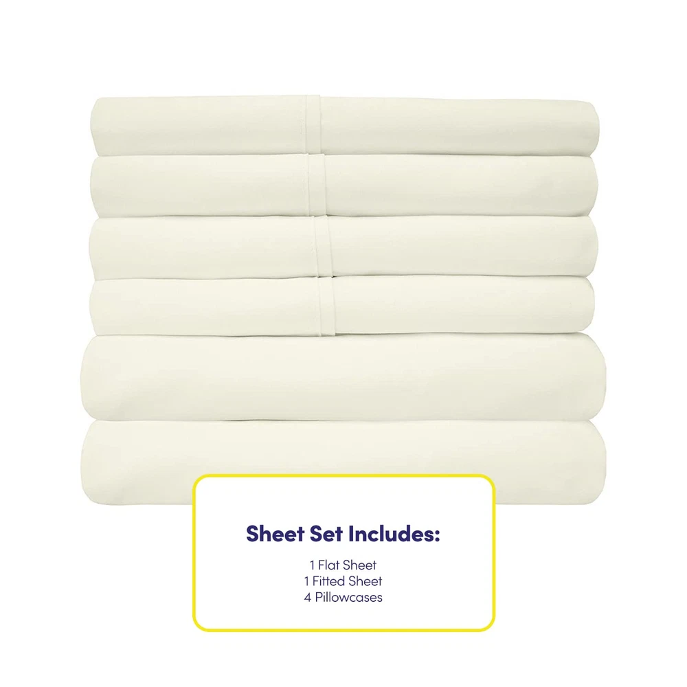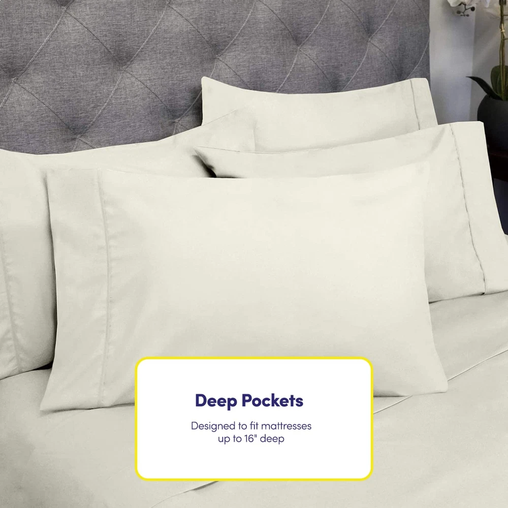 Transform your bedroom into a sanctuary of comfort and style with our luxurious 6-piece bed sheet set, meticulously crafted to provide the ultimate sleeping experience. Made from premium quality microfiber fabric, these sheets boast an irresistibly soft texture that will envelop you in pure bliss as you drift off to sleep. Say goodbye to rough, scratchy bedding and hello to the indulgent embrace of our sumptuous sheets, designed to pamper you with every touch. Whether you're curling up with a good book or drifting off into dreamland, our bed sheet set promises unparalleled comfort and relaxation, night after night. Experience the difference of a secure and snug fit with our innovative built-in sheet straps, ensuring that your sheets stay in place throughout the night. No more waking up to find your sheets bunched up at the foot of the bed or slipping off the corners. Our sheet straps are designed to provide maximum grip and stability, so you can enjoy uninterrupted sleep without the hassle of constantly readjusting your bedding. With our bed sheet set, you can rest easy knowing that your sheets will stay securely in place, even if you toss and turn during the night. Say goodbye to restless nights and hello to a peaceful and restorative sleep experience. Add a touch of personality to your bedroom with our wide selection of over 40 captivating colors and prints. Whether you prefer classic neutrals, bold hues, or eye-catching patterns, we have the perfect option to complement any decor style or personal taste. Mix and match different colors and prints to create your own unique bedding ensemble that reflects your individual style and personality. Elevate the aesthetic appeal of your bedroom and make a statement with our stylish and versatile bed sheet set. With so many options to choose from, the possibilities are endless. Each set includes a flat sheet, fitted sheet, and four pillowcases (except for twin and twin XL sizes, which come with pillowcases), providing everything you need for a complete bedding ensemble. Our bed sheet set takes the guesswork out of styling your bed, offering a convenient and coordinated solution that is both functional and fashionable. Enjoy the convenience of a fully coordinated bedding look that exudes sophistication and elegance. Treat yourself to the luxury of premium quality bedding that offers both style and comfort in convenient package. Experience the ultimate in comfort and style with our luxurious 6-piece bed sheet set. ELASTIC CORNERS BUILT IN - What separates our bed sheets from the rest are the special elastic sheet straps built in. These elastic corners keep your fitted sheet secure to the bed and come on all of our sheets. SLEEP IN LUXURY – No more sleepless nights on uncomfortably itchy sheets! Sleep soundly on the softest 1500 Supreme Deluxe Collection sheets. Be warned, though: You may never be an early bird again! SUPERB SHEET SET – Each luxurious set has 1 fitted, 1 flat sheet, and 4 pillowcases (NOTE: Twin & Twin XL sizes include 2 pillowcases). Deep pockets, thick elastic, and BUILT IN SHEET STRAPS make your new soft sheets stay in place! STAY CLEANER, LONGER – Who has time to wash their sheets every few nights? When it’s time for a wash, machine wash cold, and tumble dry low. PERFECT FIT FOR ANY BED – Sleep soundly for years to come! Your deep pocket sheets are fade, shrink, and resistant. We’ve got you (and your bed) covered.