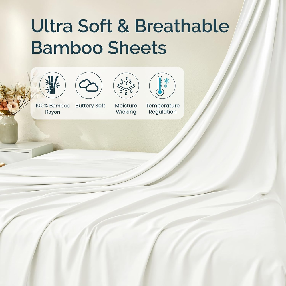 Queen Size Bed Sheets 6 Piece Set, 100% Rayon Derived from Bamboo, Cooling for Hot Sleepers-Luxury Breathable Soft Sheets, Deep Pocket 16" Fitted Sheet with Elastic Corner Straps, Cream White Ships from USA | 30-Day Free Returns Product Details: Item model number Bed Sheet Set Style Modern Pattern Solid Country of Origin China Number of Pieces 6 Unit Count 6.0 Count Pillowcase Quantity 4 Product Dimensions 9.84 x 5.91 x 16.5 inches Material Rayon Derived from Bamboo Item Display Dimensions 9.84 x 2 x 5.91 x 6.5 inches Age Range (Description) Adult Seasons All, Summer, Spring Closure Type Envelope Item dimensions L x W x H 9.84 x 5.91 x 16.5 inches Item Weight 6.34 pounds Special Feature Deep Pocket, Fully Elasticized, Moisture Wicking, Cooling for Hot Sleepers Color 01 Cream White Thread Count 300 Included Components Pillowcase * 4, Flat Sheet * 1, Fitted Sheet * 1 Product Care Instructions Machine Wash Size Queen - 6 PCS Why Buy From Us: Fast & FREE Shipping on all orders All items ship directly from USA warehouses Easy returns – your satisfaction is our priority 24/7 customer support – we’re here to help Shipping & Handling: Most orders are processed within 1 business day . Tracking will be uploaded as soon as your order ships. Estimated delivery time: 2-5 business days . Returns: If you’re not fully satisfied, return the item within 30 days for a full refund or exchange. Buyer pays return shipping unless the item arrives damaged or defective. Shop with confidence – Thousands of happy customers trust us for quality products and fast service!