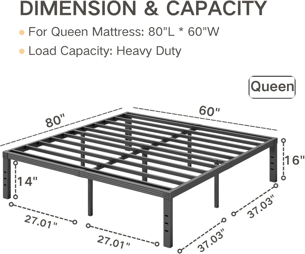 Store New Arrivals Add to Favorite View Feedback Contact Queen Size Bed Frame 16 Inches High, Heavy Duty Steel Slats with Heavy Duty Support for Mattress,No Box Spring Needed, Noise-Free,Easy Assembly Product Information Item model number Queen Finish Type Steel Style 16 Inch Maximum Weight Recommendation 1000 Pounds Furniture Finish Black Assembly Required Yes Color Black Material Metal Style 16 Inch Product Dimensions 80"L x 60"W x 16"H Country of Origin China Compatible With Mattress Size Queen Item Weight 31.3 pounds Ground To Item Distance 16 Inches Included Components Slat Size Queen Special Feature Squeak Resistant, Easy Assembly ABOUT US We are proud to be based in the United States, with all of our products shipping directly from within the country. Our selection includes home décor, furniture, sports equipment, tools, pet products, and more. If you have any questions about our products, we’re always happy to help. SHIPPING We are always working hard to ensure your package arrives as soon as possible. Please understand that some factors like weather, high postal traffic, and the performance of shipping companies are outside of our control. We offer free shipping to the lower 48 states and ship within 2 business days of payment, usually sooner. For shipping outside of the continental USA, we only use eBay's Global Shipping Program. The item is shipped to IL and then sent to the rest of the world. RETURNS We offer Free Returns for 30-Days on items which you are not completely satisfied with. You have the option for a full-refund or an exchange of the item. CUSTOMER SATISFACTION We try our very best to make sure every customer is completely satisfied. If there's a problem, message us! We're happy to help.