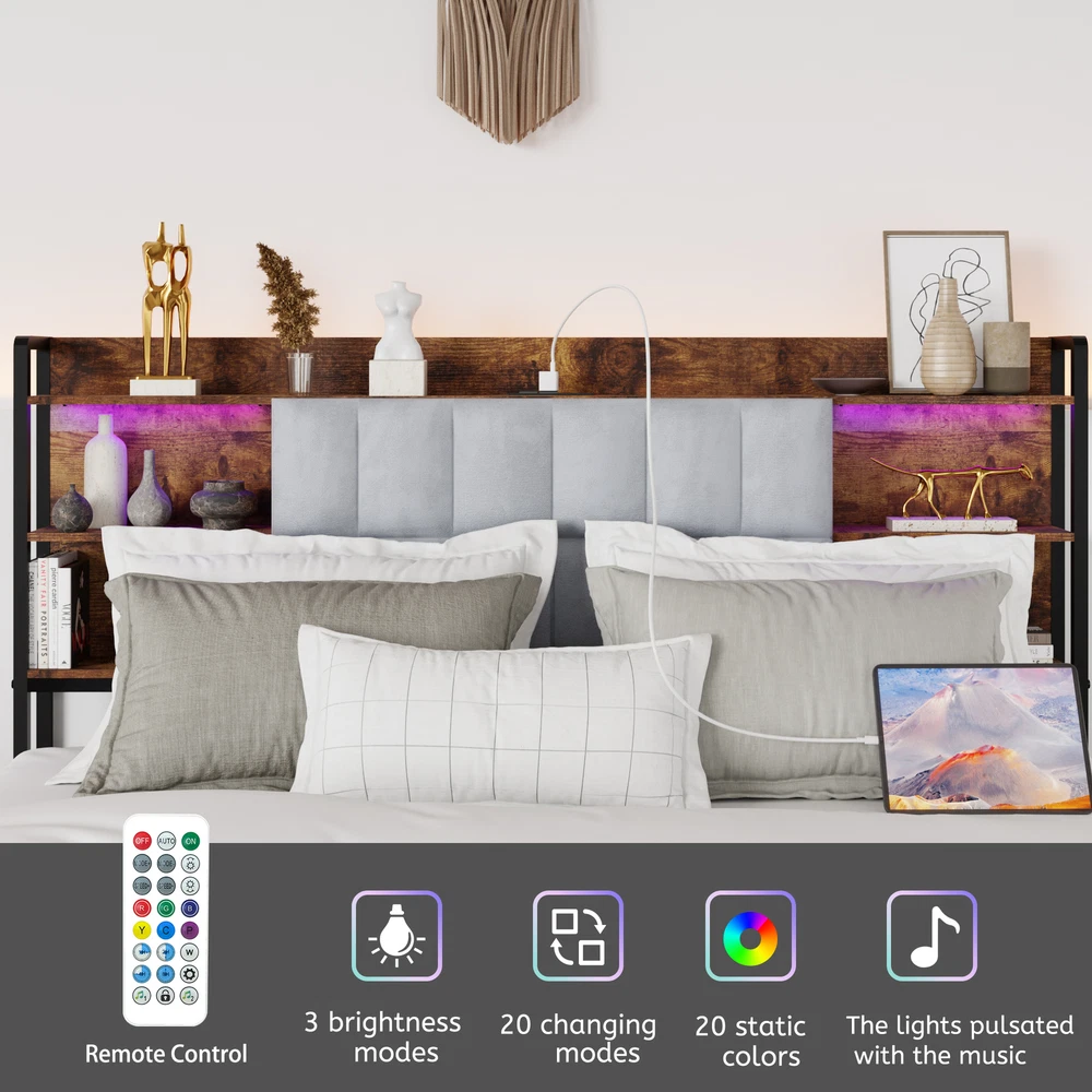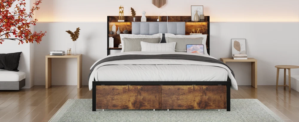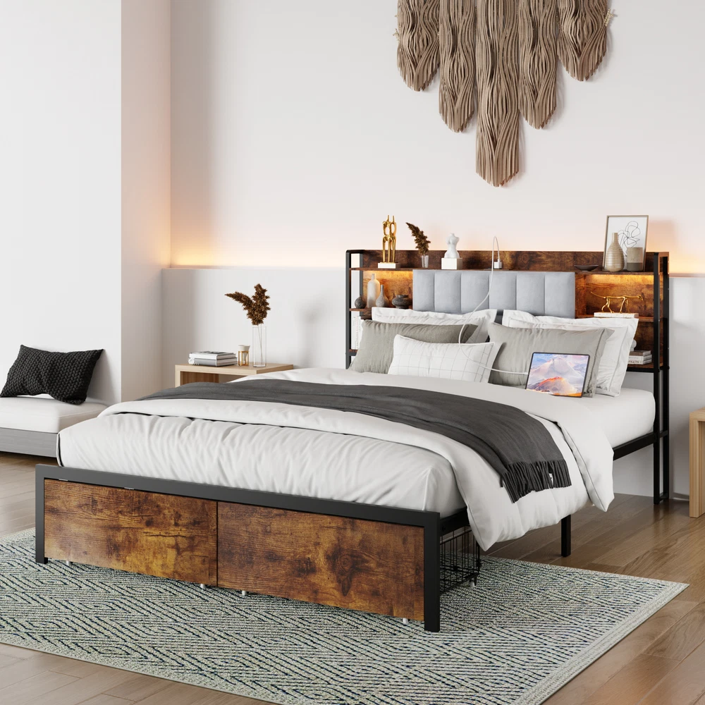 Queen Size Bed Frame with 2 Storage Drawers and LED Lights Headboard, Upholstere