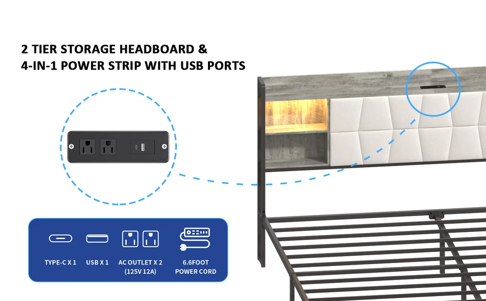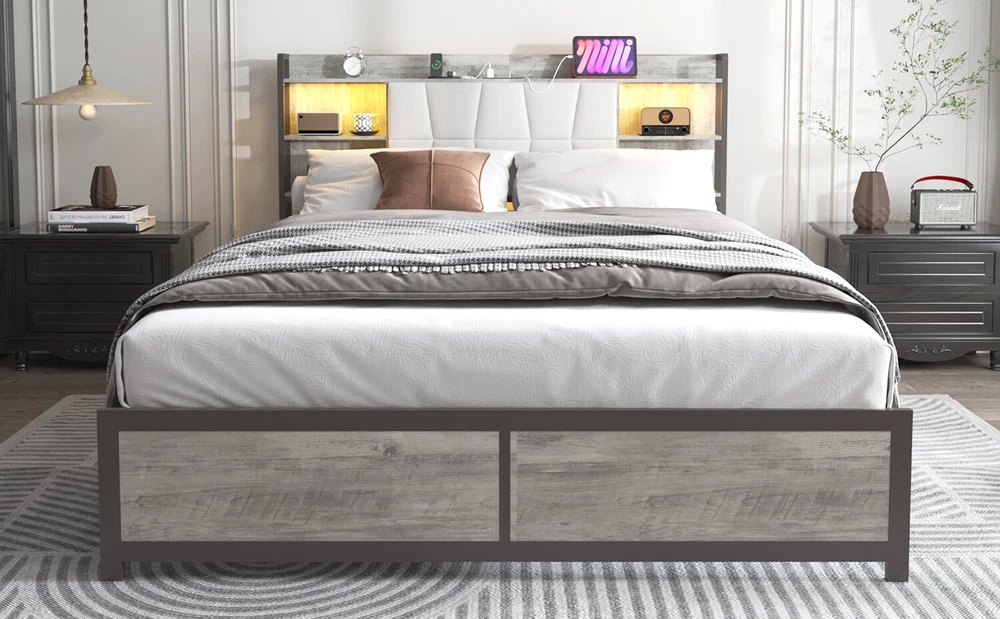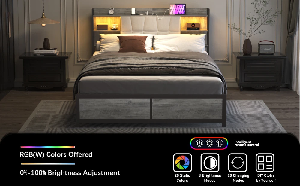 Queen Size Bed Frame with LED Light & Power Outlet, Platform Bed with Upholstere