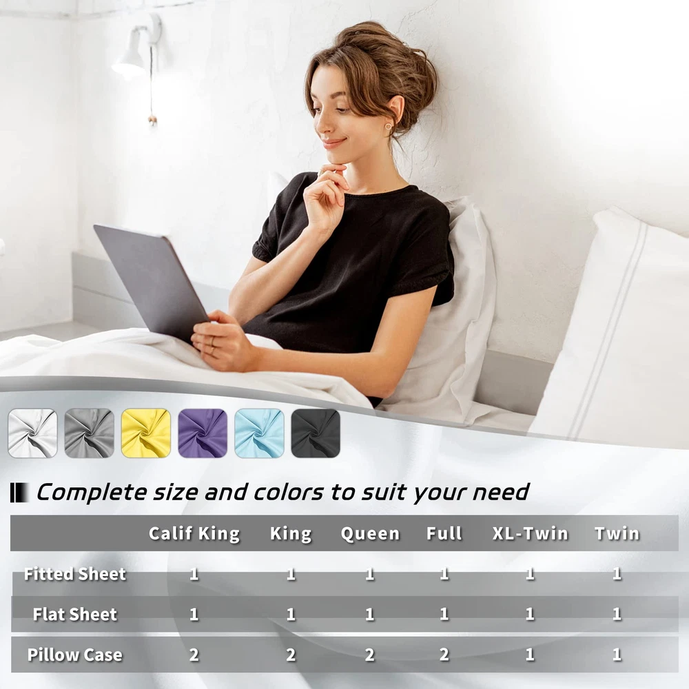 PERFECT FIT FOR YOUR BED: Queen sheets Include 1 Flat Sheet (90”x 102”)1 Fitted Sheet (60”x 80”) 2 Pillow Case (20”x 30”). microfiber Bed sheet set is designed to fit nearly all mattresses with a depth that does not exceed 18". It fits so well that you don't have to worry about how it will loosen up in bed. COMFORTABLE ENVIRONMENT: bed sheets are hypoallergenic, stain resistant, fade resistant. Featuring premium polyester microfiber fabric brushed on both sides and our sheets set deliver exceptional softness for restful sleep all year round. The sheet is very cozy which keeps you cool during summers and warm during winters. JUST LIKE SLEEPING ON CLOUDS - luxury 4 piece queen sheet set is made from 100% Double Brushed Microfiber Polyester. These sheets have deep pockets to will fit even the 18 inches mattresses.They are softer, smoother, more resilient and more breathable, bringing you a comfortable and relaxing night's sleep here, make you sleep better and wake up each morning feeling refreshed and full of energy. EASY CARE: They are machine washable in cold water and dry quickly on tumble! Do not bleach. Equivalent to 1800 Thread Count queen size Sheet Sets. Brand New and Factory Sealed No Ironing Necessary. sheet set is a wonderful sleeping gift for ANY HOLIDAYS (Christmas, Thanksgiving Day, Halloween, Valentine's Day, New Year's Day, Easter Day, Mother's Day, Father's Day,Birthday); ANY OCCASIONS (Back to school, home, watching TV, reading or just ideal to cozy up on the bed relaxing at the end of a long day); ANYONE YOU CARED (, parents, lovers, friends ), give your loved ones the all-natural sleep and wake up healthy and pleasant.