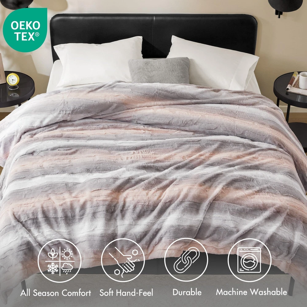 The Zuri blanket features a luxuriously soft faux fur and reverses to a solid faux mink. This faux fur throw is the perfect modern update and adds a glamorous accent to your home. This throw is machine washable for easy care and OEKO-TEX certified, meaning it does not contain any harmful substances or chemicals to ensure quality comfort and wellness. Cozy Snuggles: Indulge in the sumptuous comfort of our luxurious faux fur- mink reversible throw. With its lush fur design, it wraps you in a cozy embrace. For best results on first use, set the dryer to "no heat" or "air fluff" to remove loose fibers Ideal Gift Choice: This luxurious & cozy blanket featuring a warm and cozy furry design makes it a perfect gift for girls, teens, and women on special occasions like Christmas, Thanksgiving, and birthdays Extra comfort for everyday luxury: Whether you're snuggled up for a movie night or seeking comfort at office, our elegantly soft and plush cozy and fuzzy throw ensures you're pampered in warmth and luxury Irresistibly Soft: Made from poly fur, this reversible blanket delivers a buttery-soft feel that’s truly irresistible. Sized at 90 x 90 inches, it’s perfect for full and queen beds, offering generous full-body coverage for cozy comfort DURABLE & EASY CARE: Our faux fur reversible to plush blanket boasts quality stitching offers durability to withstand daily wear and tear. For easy care, simply machine wash separately in cold water on a gentle cycle and tumble dry on low / no heat