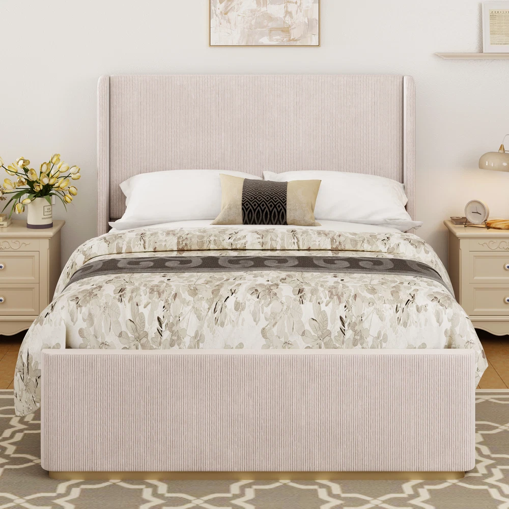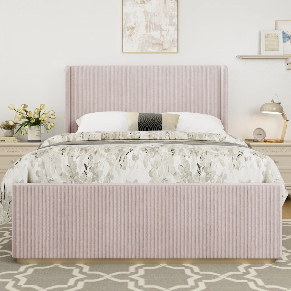 Brand Unbranded Item Length 61.5 Item Width 25.50 Item Height 8.00 Color Pink Frame Material Wood Type BED FRAME Compatible Mattress Size As described Diamond-ring-1 Simple life Queen Size Corduroy Upholstered Bed Frame with Vertical Stripe Wingback Headboard and High Footboard, Pink Luxurious Corduroy Fabric: Upholstered in soft, vertical-striped corduroy, this bed exudes luxury and warmth. The rich texture adds depth to your decor while offering a cozy feel that complements any design theme. Elegant Wingback Design: The striking 47" high wingback headboard not only enhances your bedroom's aesthetics but also provides extra support when sitting up in bed, making it perfect for reading or lounging. Durable Construction: Built with a robust metal frame and sturdy wooden slats, this bed ensures exceptional stability and support, providing a solid foundation for your mattress and guaranteeing a restful night’s sleep. No Box Spring Required: Designed for convenience, this bed eliminates the need for a box spring. Simply place your mattress directly on the slats, making setup and maintenance easier than ever. Easy Assembly: The bed and storage bench come with clear, straightforward assembly instructions, allowing you to set up your new furniture quickly and effortlessly without requiring specialized tools. Elevate your bedroom decor with our luxurious upholstered bed, featuring a vertical-striped corduroy fabric that adds texture and sophistication. The impressive high wingback headboard provides both style and comfort, while the sturdy combination of a metal frame and wooden slats ensures lasting durability without the need for a box spring. Easy to assemble, this bed is the ideal blend of style and functionality. Luxurious Corduroy Fabric Upholstered in soft, vertical-striped corduroy, this bed exudes luxury and warmth. The rich texture adds depth to your decor while offering a cozy feel that complements any design theme. Vertical Stripe Design Feature vertical channel tufting in soft fabric, provides extra support for your neck and back. Thick wings give a unique and classical appearance Durable Construction Built with a robust metal frame and sturdy wooden slats, this bed ensures exceptional stability and support, providing a solid foundation for your mattress and guaranteeing a restful night’s sleep. Queen Weight Capacity 600 LBS Material Wood + Metal Assembly Required Yes Recommend Mattress 10-12" Fabric Material Corduroy Item Specifics Brand Unbranded Item Length 61.5 Item Width 25.50 Item Height 8.00 Color Pink Frame Material Wood Type BED FRAME Compatible Mattress Size As described Payment Returns Diamond-ring-1 Simple life DESCRIPTION PAYMENT SHIPPING RETURN POLICY CONTACT US Shop Category Store Home Other Hot Item Delivery New List Item Help & Info Payment Policy Shipping Policy Return Policy FAQ About Us Queen Size Corduroy Upholstered Bed Frame with Vertical Stripe Wingback Headboard and High Footboard, Pink Luxurious Corduroy Fabric: Upholstered in soft, vertical-striped corduroy, this bed exudes luxury and warmth. The rich texture adds depth to your decor while offering a cozy feel that complements any design theme. Elegant Wingback Design: The striking 47" high wingback headboard not only enhances your bedroom's aesthetics but also provides extra support when sitting up in bed, making it perfect for reading or lounging. Durable Construction: Built with a robust metal frame and sturdy wooden slats, this bed ensures exceptional stability and support, providing a solid foundation for your mattress and guaranteeing a restful night’s sleep. No Box Spring Required: Designed for convenience, this bed eliminates the need for a box spring. Simply place your mattress directly on the slats, making setup and maintenance easier than ever. Easy Assembly: The bed and storage bench come with clear, straightforward assembly instructions, allowing you to set up your new furniture quickly and effortlessly without requiring specialized tools. Elevate your bedroom decor with our luxurious upholstered bed, featuring a vertical-striped corduroy fabric that adds texture and sophistication. The impressive high wingback headboard provides both style and comfort, while the sturdy combination of a metal frame and wooden slats ensures lasting durability without the need for a box spring. Easy to assemble, this bed is the ideal blend of style and functionality. Luxurious Corduroy Fabric Upholstered in soft, vertical-striped corduroy, this bed exudes luxury and warmth. The rich texture adds depth to your decor while offering a cozy feel that complements any design theme. Vertical Stripe Design Feature vertical channel tufting in soft fabric, provides extra support for your neck and back. Thick wings give a unique and classical appearance Durable Construction Built with a robust metal frame and sturdy wooden slats, this bed ensures exceptional stability and support, providing a solid foundation for your mattress and guaranteeing a restful night’s sleep. Queen Weight Capacity 600 LBS Material Wood + Metal Assembly Required Yes Recommend Mattress 10-12" Fabric Material Corduroy Item Specifics Brand : Unbranded Item Length : 61.5 Item Width : 25.50 Item Height : 8.00 Color : Pink Frame Material : Wood Type : BED FRAME Compatible Mattress Size : As described Payment Returns All rights reserved.