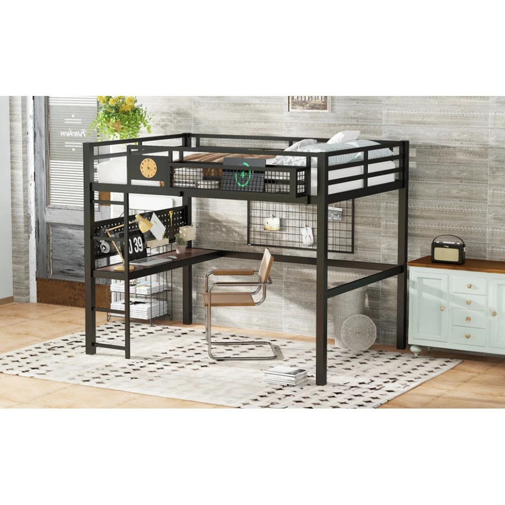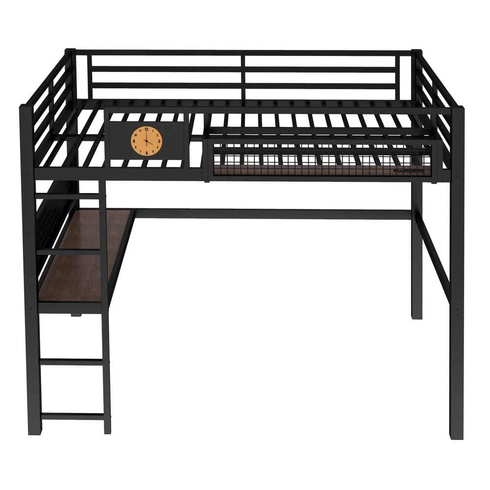 Queen Size Loft Bed Frame with desk storage basket Metal Loft Bed with clock Features 【Side Clock Design】A clock is designed beside the bed, allowing users to easily check the time while getting in and out of bed or moving around its vicinity. This fulfills the daily need to know the time, providing a reference for daily activities. The design occupies no space on the bed itself while delivering practical functionality. 【Bedside storage basket】The headboard features a storage basket for conveniently storing books, phones, and other small items. Equipped with a charging port, it allows you to charge electronic devices effortlessly from bed without searching for an outlet, meeting your daily power needs. 【Pegboard and desk】The space beneath the bed is designed as a desk area, providing a dedicated study and work zone that eliminates the need for an additional desk, thereby saving valuable room space. The included pegboard allows for hanging small tools, decorative items, and more according to your needs, further enhancing the space's storage and display functionality. 【Simple and versatile style】The overall design is sleek and sophisticated, combining black metal with functional components. Its clean lines effortlessly complement modern, industrial, and various other interior styles, adding a touch of minimalist elegance to any space. 【Easy to Assemble】All parts included in your package are indicated clearly. With step-by-step installation manual and pre-drilled holes, you can easily assemble this bed individually. Descriptions Descriptions This metal loft bed is an excellent choice for optimizing space in compact living areas. The storage basket beside the upper bed not only holds books and small items but also features a charging port, allowing you to charge electronic devices from the comfort of your bed—super convenient. The clock on the side makes checking the time effortless while moving around the bed. The lower desk paired with a pegboard creates a dedicated study or work area. The pegboard allows flexible hanging of small items, balancing storage and display. The sturdy metal frame ensures durability and strong weight capacity for safe use. Its minimalist design effortlessly complements various home decor styles, transforming limited space into a multifunctional area for sleeping, storage, and studying—bringing greater convenience and comfort to daily life. Weight & Dimensions Product Type Metal Loft Bed Color Black Size QUEEN Material Metal+MDF Overall Product Dimension 82.7”L*63’’W*68”H Overall Product Weight 106LBS Recommend Mattress Thickness 6'' Number of Package 2 Package Dimension & Weight Please refer to the Specification Level of Assembly Full Assembly Needed Eligible for Hardware Packs Yes Country of Origin China Note All the pictures are taken by actual samples, slight chromatic aberration may occur due to lighting or display. Weight Capacity The table has a weight capacity of approximately 200 lbs, and the net has a weight capacity of approximately 60 lbs.