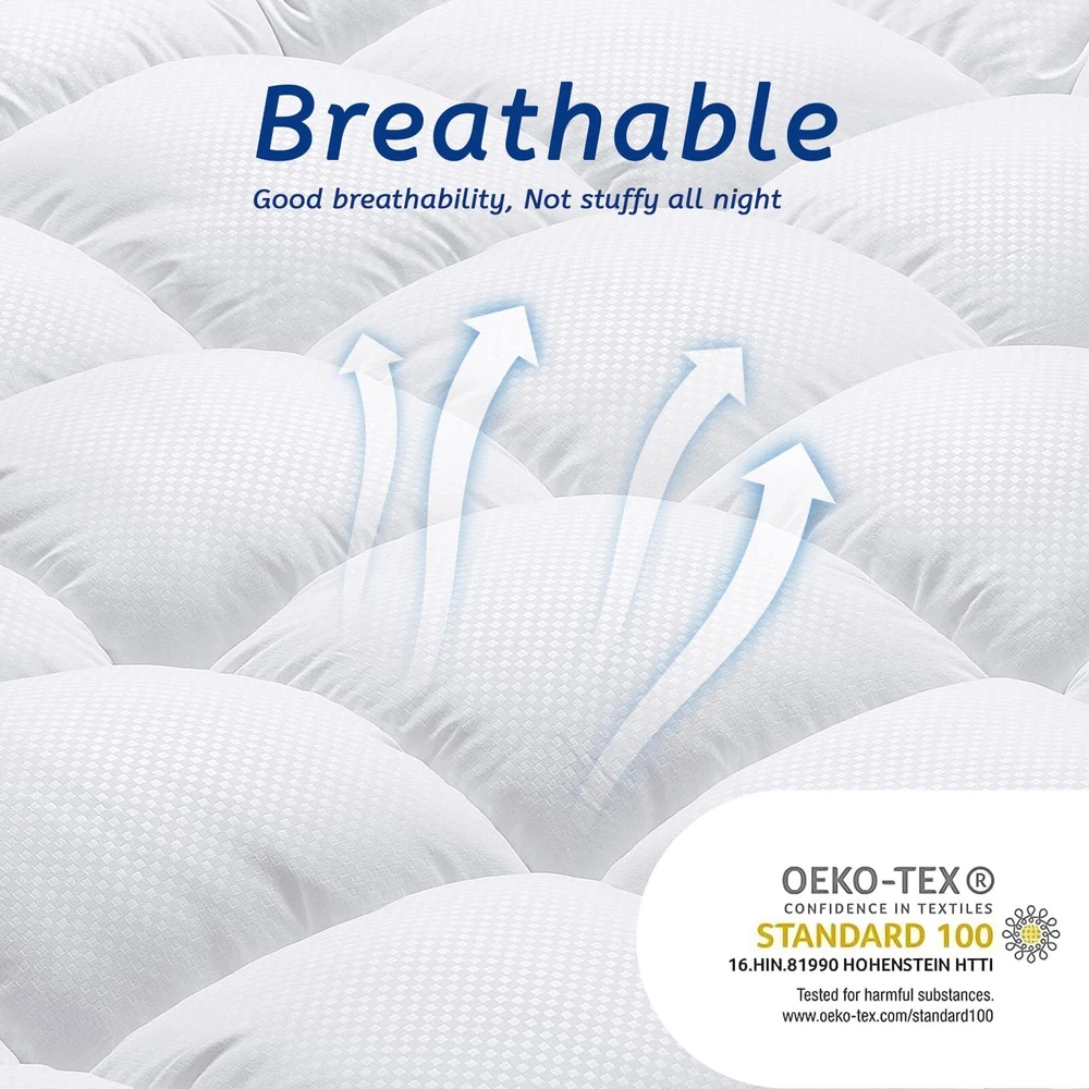 Extra Thick & Supportive: Queen Size Mattress Topper (60"x80") is overfilled with 1000GSM 3D snow down alternative fiber, it is thicker than most mattress toppers in the market, this ensures exceptional comfort and thickness. The unique three-dimensional baffle box stitching helps each box fill even and prevent moving, this providing ample support for your body, so you wake up feeling fully refreshed each morning. Breathable & Comfortable: Enjoy breathability and superior comfort with our cloud-like surface and 3D&7D fiber three dimensional structure. It allows the mattress topper for air circulation, keeping you cool without the heat and sweat of memory foam or traditional mattresses. Deep Pocket & No-Slip: The 8"-21" elastic deep pocket wraps your mattress 360° all-around, ensuring a secure fit. Thanks to the no-slip back design, the pillow top stays in place, allowing you to toss and turn freely during those sleepy nights. Enjoy uninterrupted sleep without any worries. Machine Washable & Easy Care: Cleaning the mattress pad cover is a breeze, surpassing memory foam mattress covers or expensive bed toppers in ease of maintenance. When it gets dirty, simply toss it into a commercial washing machine, under gentle cycle with cold water & mild detergent, tumble dry low, it will come out looking fresh and clean. You can say goodbye to the hassle of cleaning and effortlessly enjoy a fresh and hygienic mattress topper. 100% Customer Satisfaction: Rest easy knowing that the mattress topper is certified and tested for harmful substances, meeting the stringent requirements of OEKO-TEX STANDARD 100. We are committed to your satisfaction and provide exceptional after-sale service. If there is any issue with your order, please don't hesitate to contact us. We will go above and beyond to resolve any problems and ensure your utmost satisfaction.