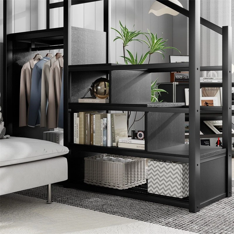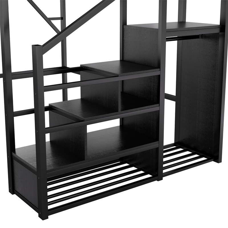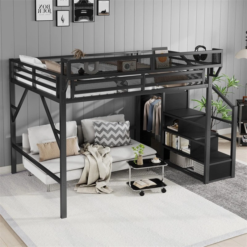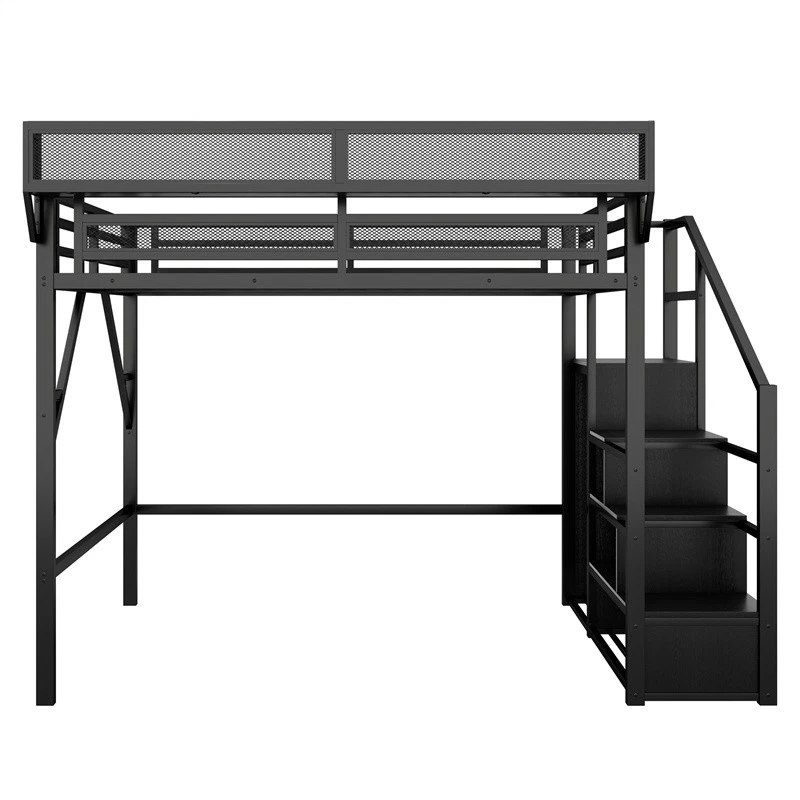 Queen Size Metal High Loft Bed w/Storage Shelves,Storage Stairs & Wardrobe,Black Features 【Queen Loft Bed with Storage Shelves for Upper】The queen metal loft bed features a storage shelf next to the upper bed, providing extra storage space. This shelf is perfect for keeping books, gadgets, or small items within easy reach. The shelf have mesh around which prevent thing falling down. It adds functionality without compromising space. Metal queen Loft Bed with Staircase】The metal queen size loft bed come with staircase includes built-in storage compartments, making it easy to store items like shoes, toys, or blankets. The steps ensure safe and convenient access to the upper bed, enhancing both practicality and safety. The stairs can be installed on either right side or left side. 【Under Space of Metal Loft Bed】54.3 inch under the queen loft bed creates extra space for multi-functional use. You can place storage cabinets, a small sofa, or a desk underneath, maximizing the use of limited space and creating a versatile living area. 【Metal Loft Bed with Wardrobe】The staircase features a built-in wardrobe function, providing additional storage for clothes and accessories. This clever design adds more functionality to the metal queen loft bed, making it a perfect solution for small bedrooms. 【Durable and Sturdy Construction】The queen size metal loft bed made from high-quality metal, this loft bed is durable and sturdy. The metal material ensures long-lasting use and stability, while also offering a sleek and modern look that fits well in any bedroom.Weight capacity is 400LBS. Descriptions Queen Size Loft Bed with Stairs, Metal Queen Loft Bed with Storage Shelves This queen size loft bed features built-in storage shelves next to the upper bed. Come with staircase and wardrobe. The sturdy metal design ensures stability and durability, making your bedtime routine more organized and efficient. Description & Dimensions Color: Black Material: Metal Overall Dimensions: 99.4” x 63.4”x 73.4” (L x W x H) Size: Queen Size Height of Upper Guardrail: 11.3" Clearance Under the Bed 54.3" Recommended Mattress Thickness 6”(not included) Weight Capacity: 400LBS Net Weight: 168.3 lbs Gross Weight 182.82 lbs Box Spring Required No Country of Origin China