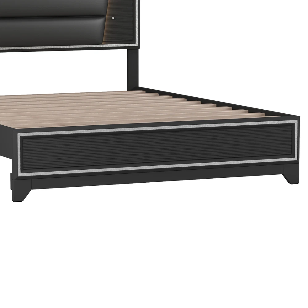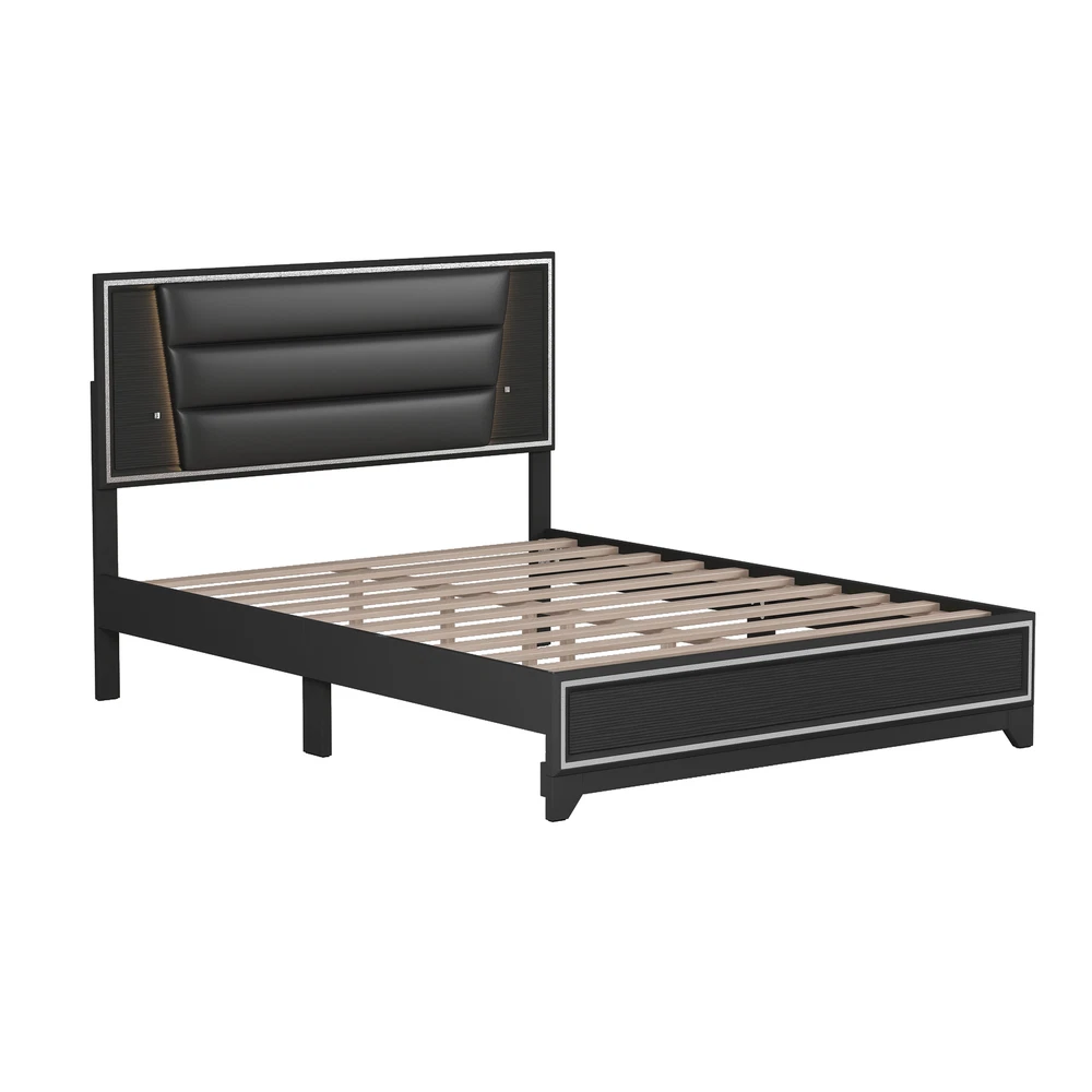 Queen Size PU Upholstered Bed, Headboard with LED Light Strips and Sparkling Shi