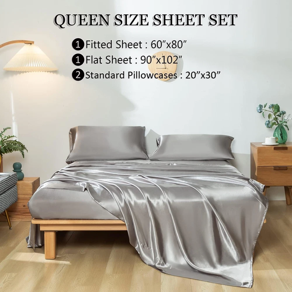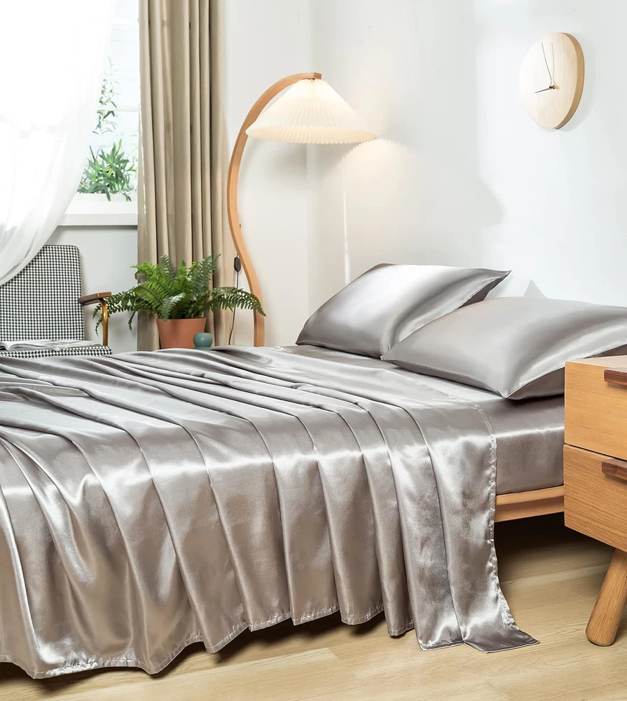 Queen Size Silky Soft Gray Satin Sheet Set, 4 Pcs, Fits 16" Deep Pocket