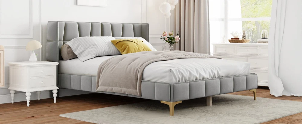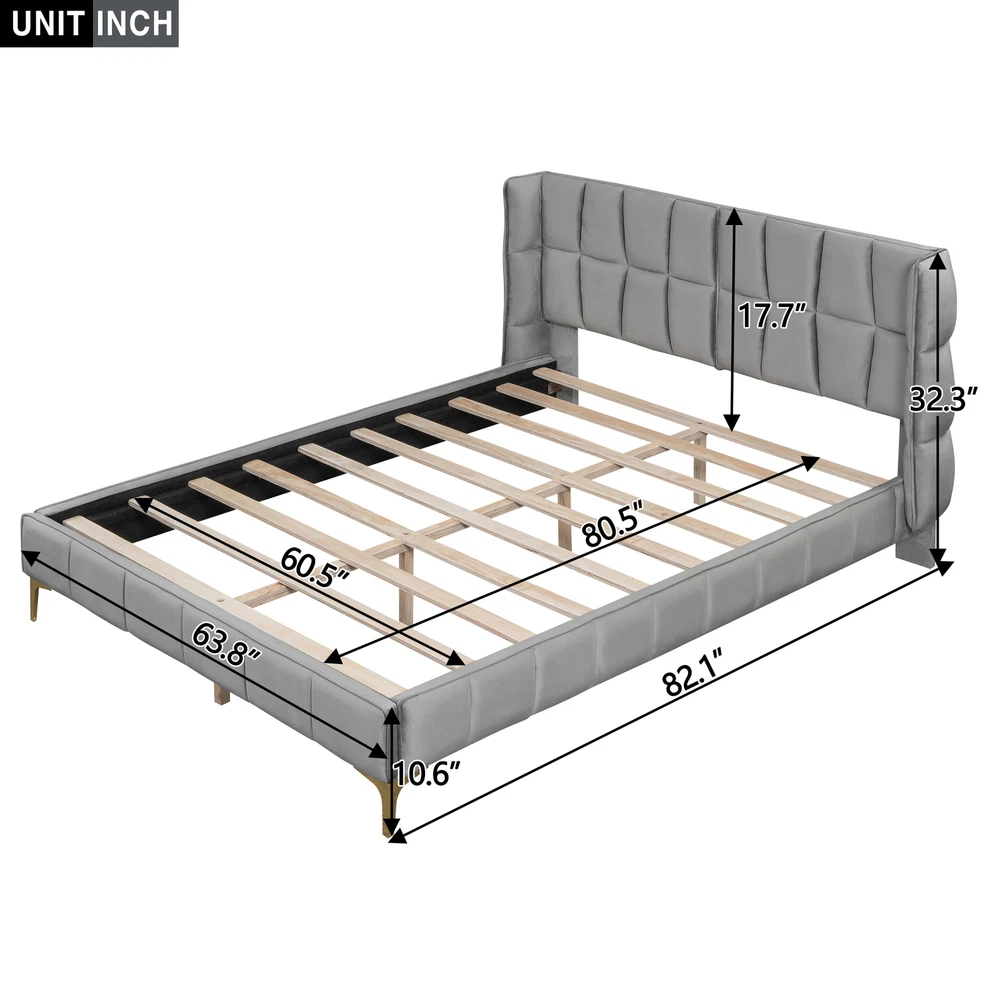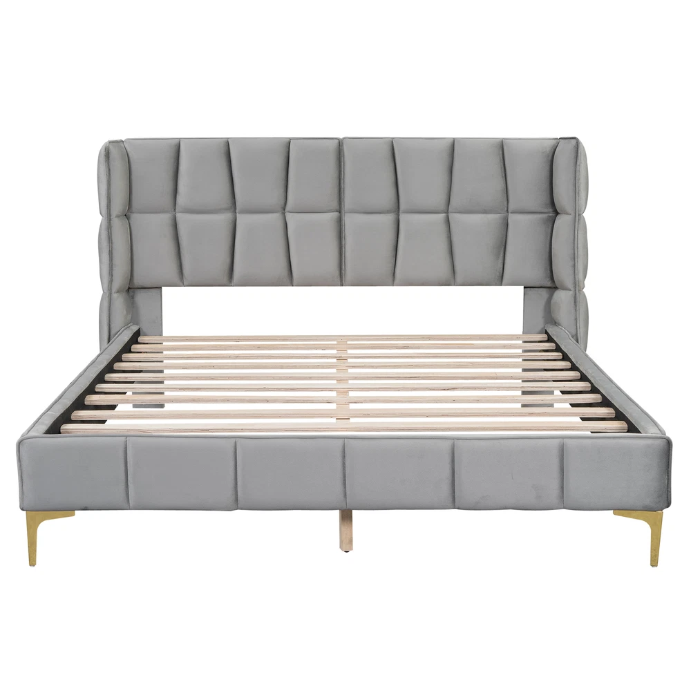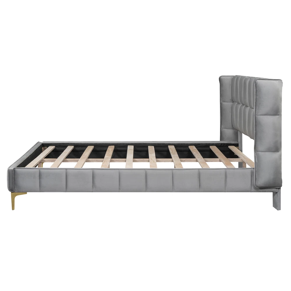 Queen Size Upholstered Velvet Platform Bed, Gray