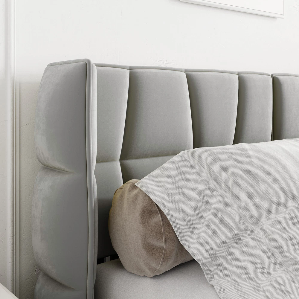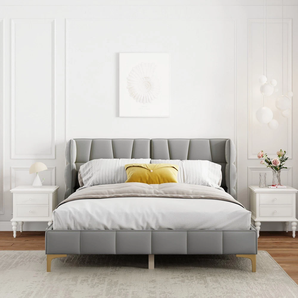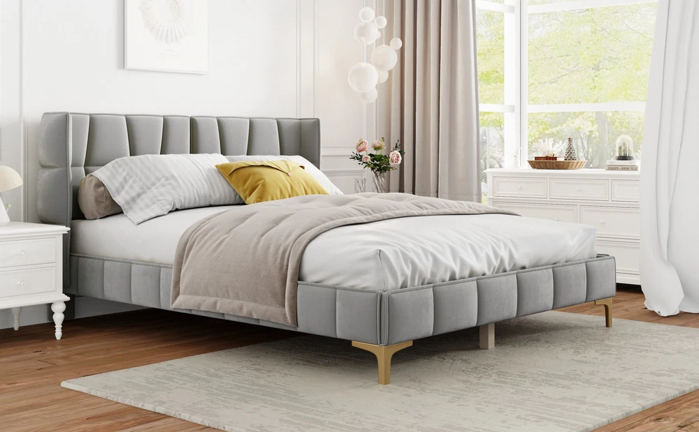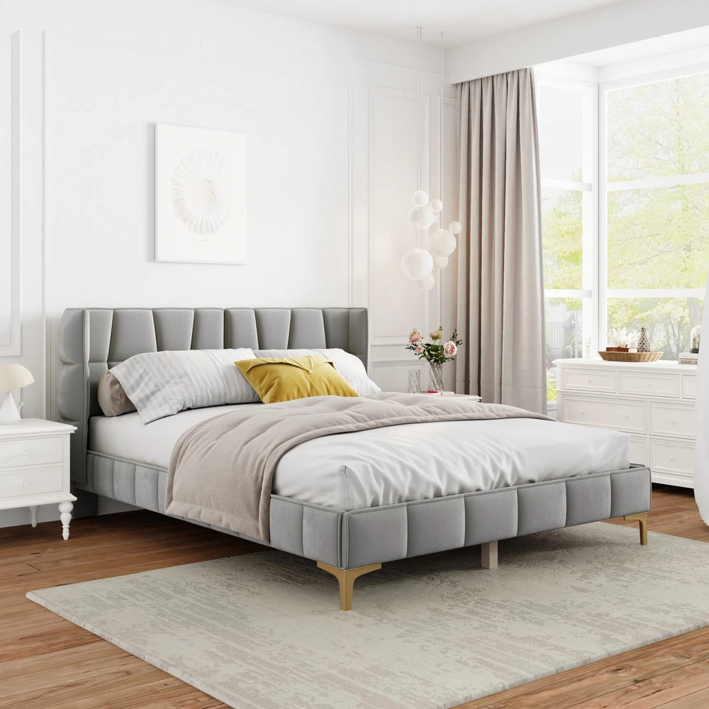 Queen Size Upholstered Velvet Platform Bed, Gray