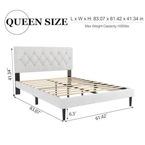 Return Policy Fast Delivery Trusted seller Queen Size Platform Bed Frame with Upholstered Button Tufted Headboard, Mattress Foundation with Wooden Slat Support, Noise Free, No Box Spring Needed, Easy Assembly, Light Grey Product Description Premium Comfort: Enjoy cozy & inviting soft linen and foam upholstery for ultimate comfort Classic Charm: Add timeless elegance to your bedroom with a button tufted upholstered headboard Durability & Stability: Built with thick wood and solid alloy for long-lasting performance and reliable support Optimal Support: Wooden slat system ensures even weight distribution, prevents sagging, and prolongs mattress life Easy Assembly: All accessories are packed in the headboard, and no extra tools required, enjoy a hassle-free assembly process Shipping Returns Payment Shipping Shipping is FREE to all addresses other than APO/PO boxes in the lower 48 states. All our stock ships from US-based warehouses. Shipped via USPS or UPS (depending on location and package weight) Unless stated otherwise, all orders will ship within 24-72 hours of your payment being processed. Check our feedback to see the great reviews of FAST shipping we offer. Returns Seller does not accept returns Payment We currently accept payment via eBay managed payments only. Once payment is cleared, we will dispatch your shipment within 1-3 business days. Please refer to the "Shipping" tab for more information regarding shipping speed to your destination.