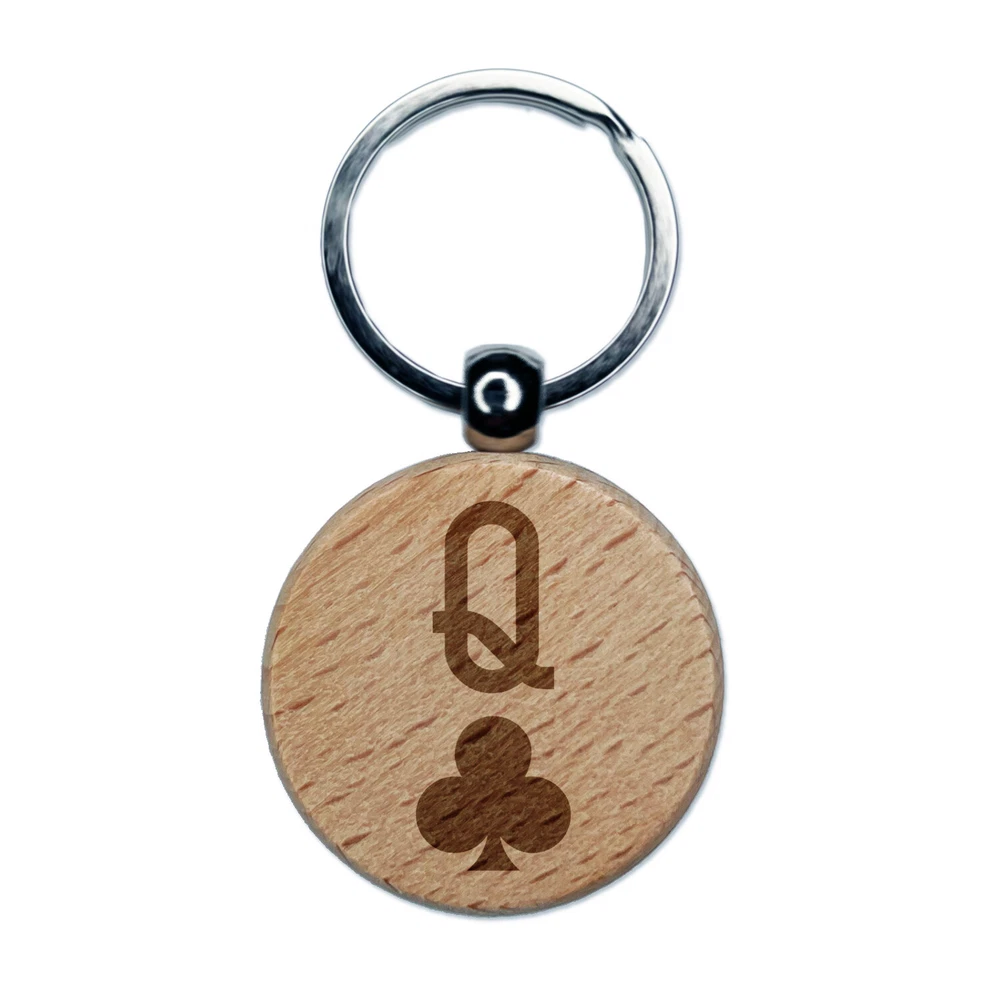 Queen of Clubs Card Suit Engraved Wood Round Keychain Tag Charm