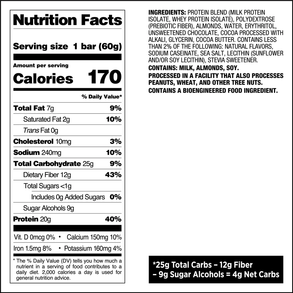 eBay Product details QuestBar Protein Bar - Double Chocolate Chunk 20g Protein Less than 1g Sugar 13g Fiber Gluten Free 23g Carbs - 13g Fiber - 6g Erythritol = 4g Net Carbs Quest is the first bar you can eat guilt free! To bring you a bar this healthy and tasty, we had to create a whole new process for making bars. Quest is so revolutionary, in fact, that we've filed a patent! That's why you won't see any other bar like it on the market. Quest is the first truly low carb bar that doesn't contain glycerin, simple carbs, sugars or artificial sweeteners. Quest Bars are the only bars that you can eat without feeling guilty! High in Fiber & Protein Gluten Free & Kosher 20g Protein, 4g Net Carbs, & 1g Sugar