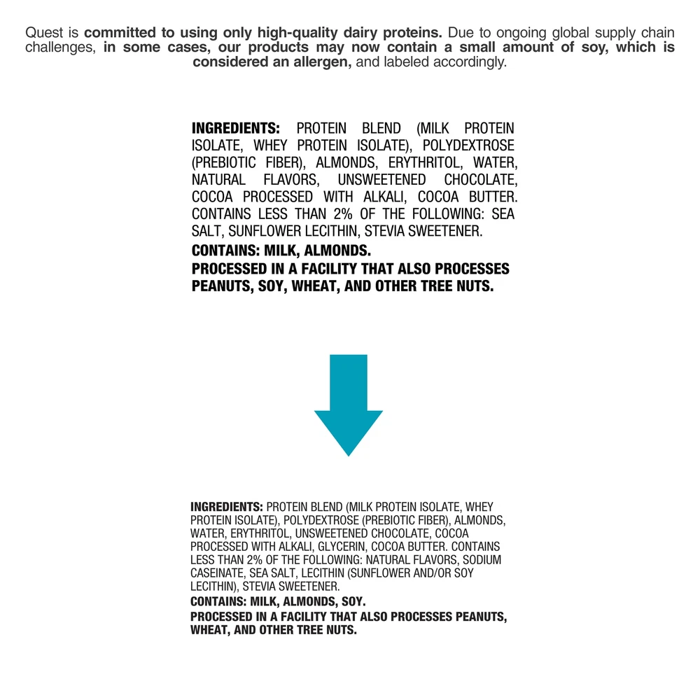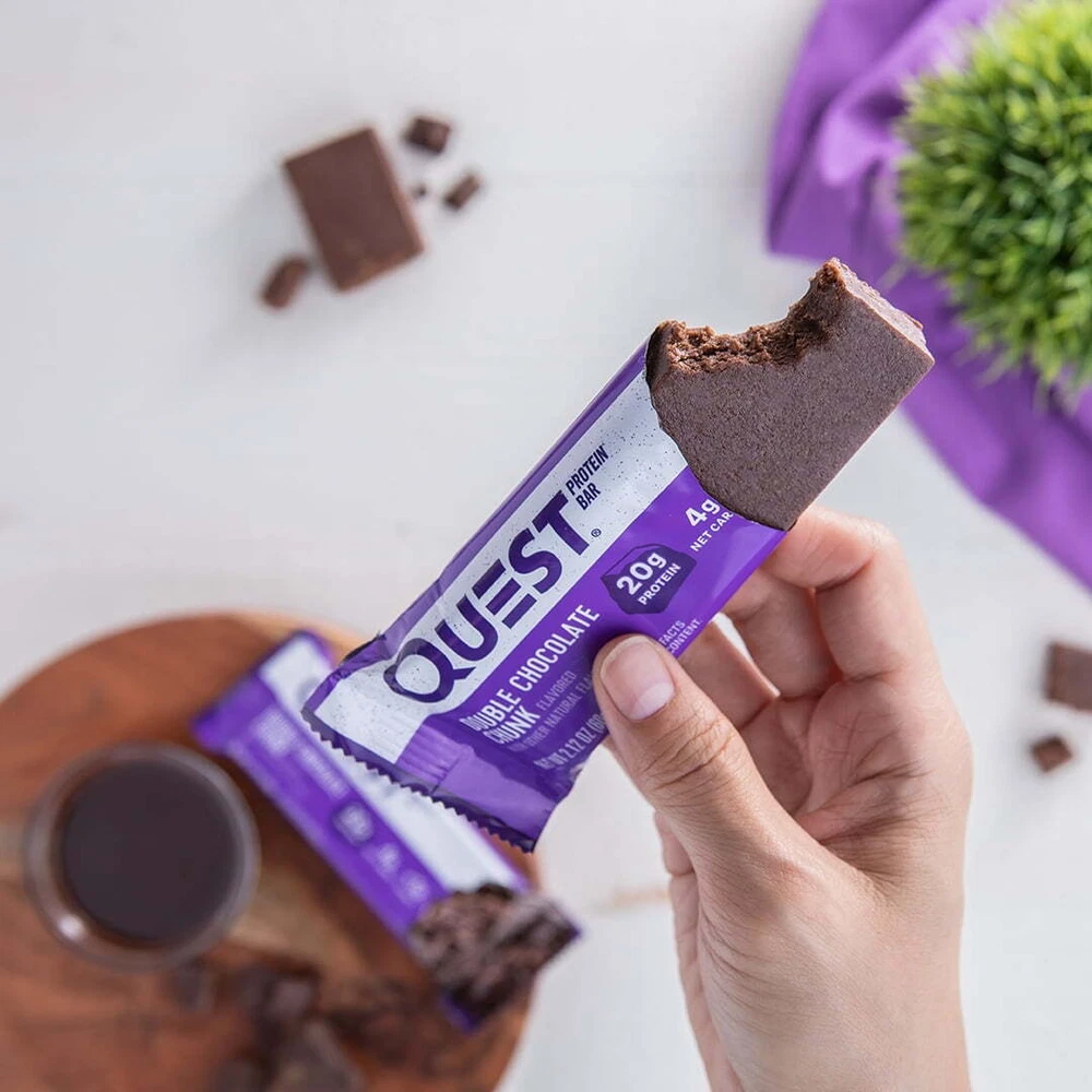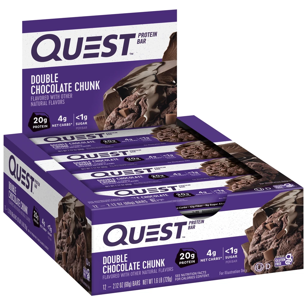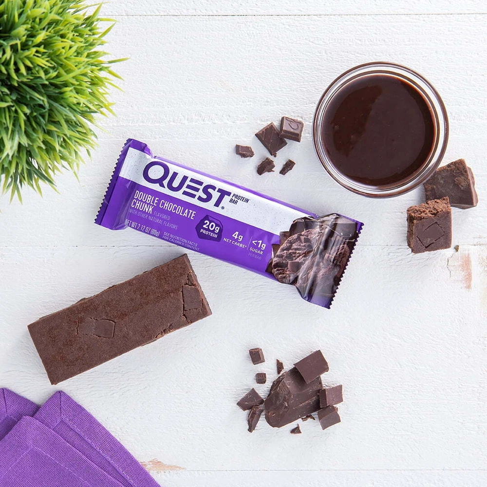 eBay Product details QuestBar Protein Bar - Double Chocolate Chunk 20g Protein Less than 1g Sugar 13g Fiber Gluten Free 23g Carbs - 13g Fiber - 6g Erythritol = 4g Net Carbs Quest is the first bar you can eat guilt free! To bring you a bar this healthy and tasty, we had to create a whole new process for making bars. Quest is so revolutionary, in fact, that we've filed a patent! That's why you won't see any other bar like it on the market. Quest is the first truly low carb bar that doesn't contain glycerin, simple carbs, sugars or artificial sweeteners. Quest Bars are the only bars that you can eat without feeling guilty! High in Fiber & Protein Gluten Free & Kosher 20g Protein, 4g Net Carbs, & 1g Sugar