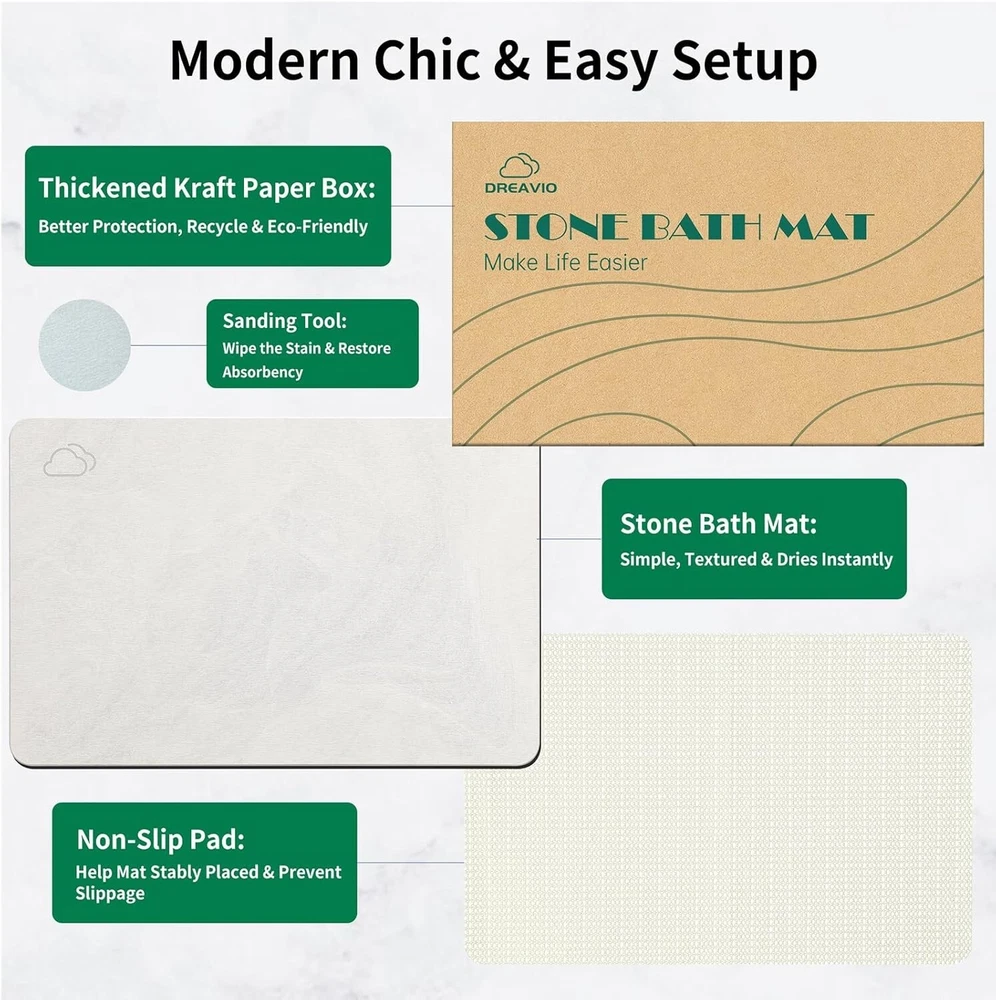 Super Absorbent 23.5"x15" Diatomaceous Earth Bath Mat - Non-Slip Marble White ‹ › ‹ › ‹ › ‹ › ‹ › ‹ › ‹ › ‹ › Super Absorbent Diatomaceous Earth Bath Mat Dimensions: 23.5"x15" | Color: Non-Slip Marble White Features: Exceptional Absorbency: Made from high-quality diatomaceous earth for quick water evaporation and keeping your feet and bathroom dry. Advanced Alternative: Say goodbye to traditional fabric mats; our diatomaceous bath mat prevents moisture issues while providing superior traction. Stability & Safety: Textured surface enhances friction, ensuring a slip-resistant experience when placed on a solid, flat surface. Easy Care: Minimal maintenance—simply rinse with water or wipe with a damp cloth; tough stains can be easily sanded away with the supplied sandpaper. Multi-Functional Design: Elegant and simple, making it a versatile addition to any room in your home; can also serve as a dish-drying mat or pet bowl mat. Benefits: Keep your bathroom dry and stylish with the elegant marble white finish. Experience the freedom from mould and odour often associated with fabric mats. Quick drying capability saves time and provides peace of mind. Durability ensures long-lasting use without compromising on style. Why choose our Diatomaceous Earth Bath Mat? Transform your bathroom experience with our Super Absorbent Diatomaceous Earth Bath Mat. Unlike traditional fabric mats that retain moisture and can lead to unpleasant odours, our innovative stone bath mat harnesses the power of nature to provide a quick-drying, ultra-absorbent solution. Its elegant marble white design adds a touch of sophistication to any space, while ensuring safety through its textured surface. Choose functional beauty for your home—make your purchase today and step onto a mat that keeps your space fresh and dry! Shipping Free & Fast Shipping - We offer free shipping to most of the USA with a normal delivery time of 3-7 days. However, due to the current situation, additional delivery time (up to 3 weeks) may be required for some items. Alternative Carriers - We may use alternative carriers (e.g. USPS, FedEx, UPS, etc.) to ensure your package arrives safely and on time. Due to the use of multiple carriers, we are unable to provide a tracking number automatically. Handling Time - Orders are processed and shipped within 1-2 business days of receiving cleared payment. Shipping Restrictions - Shipping to Alaska, Hawaii, Puerto Rico, Guam, and other US territories may incur shipping charges or delivery restrictions. Please contact us before ordering, or your order can be refunded/cancelled. State Restrictions - There may be restrictions based on your state of purchase. For example, certain items may not be shipped to California due to state regulations. Contact for Tracking Updates - If you require tracking updates or have any concerns about the delivery of your order, please feel free to contact us, and we will be happy to assist you. Return 30-Day Hassle-Free Returns - We want you to be completely satisfied with your purchase. If you are not, you can return the item within 30 days of receiving it for a full refund or exchange. Easy Return Process - To start a return, simply contact us and we will provide you with a prepaid return shipping label and detailed instructions. Restocking Fee - There are no restocking fees for returns. However, the buyer is responsible for return shipping costs if the return is not due to a seller's error. Refund Processing Time - Refunds will be processed within 5 business days of receiving the returned item in its original condition. Payment We accept all major credit cards, PayPal, and Apple Pay for your convenience. Your payment information is secure and encrypted to ensure a safe and seamless transaction. Please complete your payment within 3 days of purchase to avoid any delays in shipping. Feedback Your feedback is extremely important to us. We strive to provide the best products and customer service possible. If you are satisfied with your purchase, please take a moment to leave us a positive review. If you have any concerns or issues with your order, please contact us before leaving negative feedback. We are committed to resolving any problems and ensuring your satisfaction. Contact Us If you have any questions or concerns, please feel free to reach out to our customer support team. You can contact us through the eBay messaging system. We are available Monday to Friday, 9:00 am to 5:00 pm EST, and we will do our best to respond to your inquiry within 24 hours. Buy it now and enjoy a pleasant shopping experience! UPC: Not Set Item Height: Not Set Unit Quantity: 5.6 Material: Rubber,Diatomaceous Earth Set Includes: Bath Mat Room: Any Room,Bathroom Features: Anti-Slip,Fast Drying,Rapid Absorption,100% Anti-Slip,Easy Care,Minimal Maintenance Care Instructions: Rinse with water,Wipe with a damp cloth,Sand with sandpaper Department: Adults Theme: Stone Character: Not Set Labels & Certifications: Not Set Type: Bath Mat Color: Marble White Brand: Unbranded Number of Items in Set: 1 Shape: Rectangle Pattern: Marble Character Family: Not Set Country/Region of Manufacture: Not Set Item Width: Not Set Item Length: Not Set Product Line: Not Set MPN: Not Set Unit Type: lb