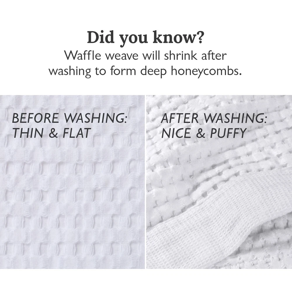 Towel Set: Includes 2 Bath Towels (32 x 62”), 2 Hand Towels (20 x 37”), 2 Wash cloths (14 x 14”). Measurements all before washing, expect 12-15% shrinkage. Super Absorbent & Quick Drying: Made of 100% long-staple Cotton, towels are flat when new. After washing, they shrink to form unique, deep “honeycombs” that instantly wick moisture away and gently exfoliate skin. Dries 40% faster than terry towels, saving time & energy. Lightweight & Compact: Naturally thin, they take up less space in the linen closet, laundry machine, gym bag, beach bag, suitcase, yacht or RV. Lint Free. Snag Free. Odor Free: Breathable weave stays fresh and won’t get stinky, even in damp bathrooms. Plus, they are lint free & snag free. Modern Style: Large honeycomb waffles with a border of tiny waffles blends luxury design with functional fabric. Unlike most waffle towels, it hangs straight even after hundreds of washes.