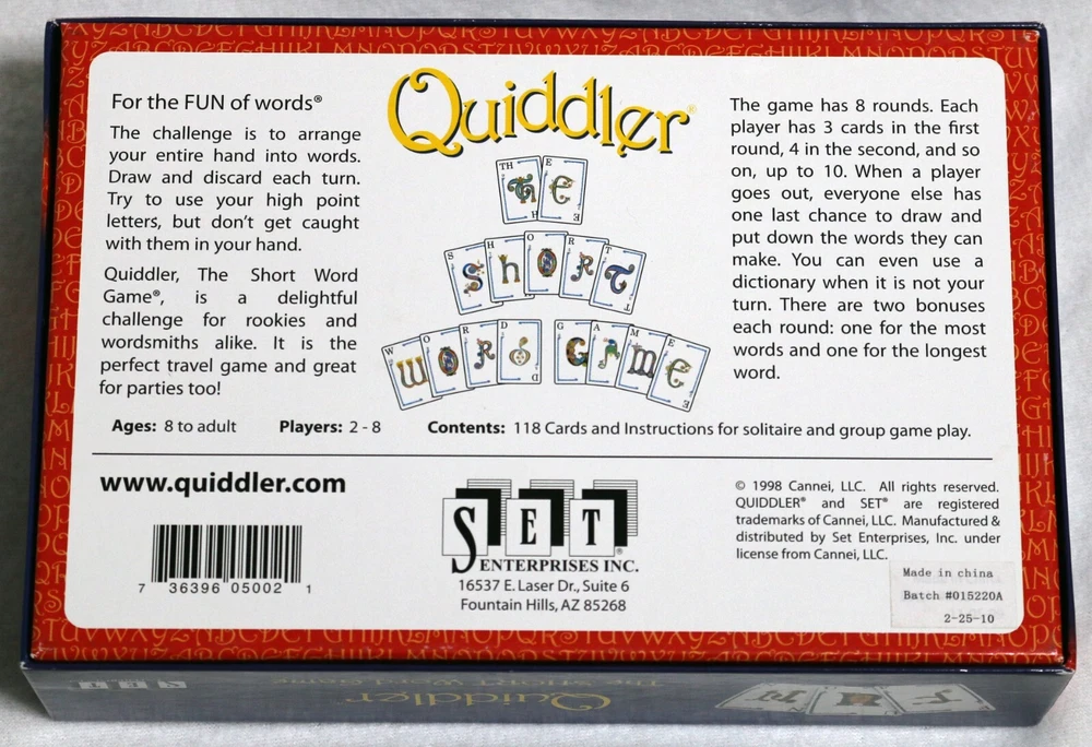 Enjoy the fun of short words with the Quiddler Card Game! This short word game is perfect for 2-8 players aged 8 and up. The game includes a deck of cards with letters and point values, making it easy to get started. This game is sure to keep you entertained for hours. The game is complete and comes from Set Enterprises, a trusted brand in the industry. So why wait? Start playing Quiddler today! This game is an excellent game for younger folks, as it can help with learning (spelling and mathematics), while having fun. Learning can be a bit painful sometimes, but not with this game. It's fun all around! Each item is carefully packaged to prevent any damage and is shipped immediately with tracking.