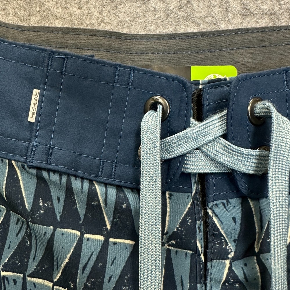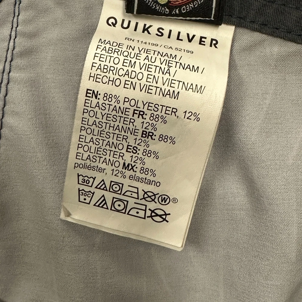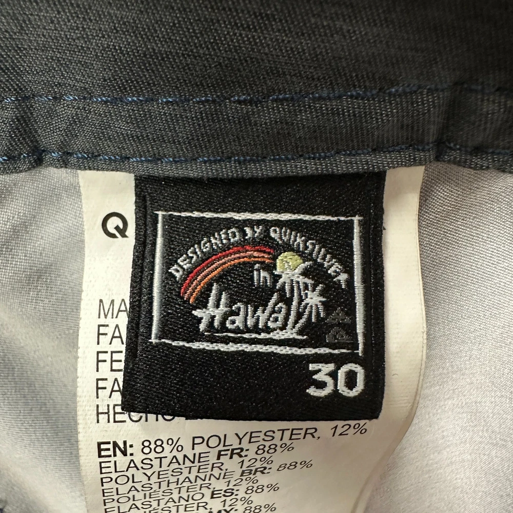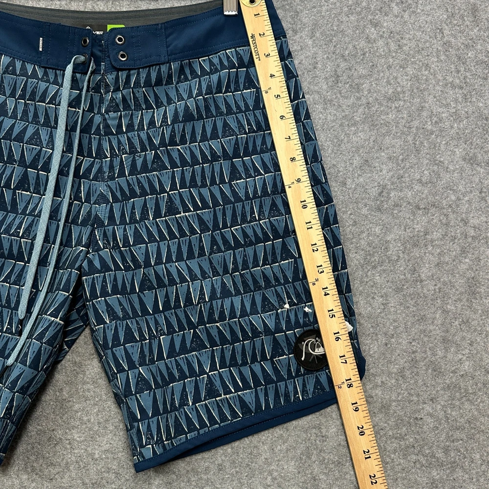 The Quiksilver Highline Boardshorts in a sail shaped geometric pattern are designed in Hawaii by surfers for surfers. Made of stretchy polyester material in a size 30 waist, these 4-way stretch board shorts offer comfort and flexibility in the water. The machine washable blended fabric ensures easy care, while the board shorts style provides a sleek silhouette for surfing performance. Featuring a hook and eye fabric strip plus laceup front closure, a back pocket with sewn in key loop, the Hawaiian islands embroidered near the Quiksilver logo, these shorts are perfect for surfers looking for functional and stylish swimwear. Made in Vietnam, these boardshorts are a must-have for any water sports enthusiast. Please review photo measurements to ensure a good fit. Ships from a smoke free home.