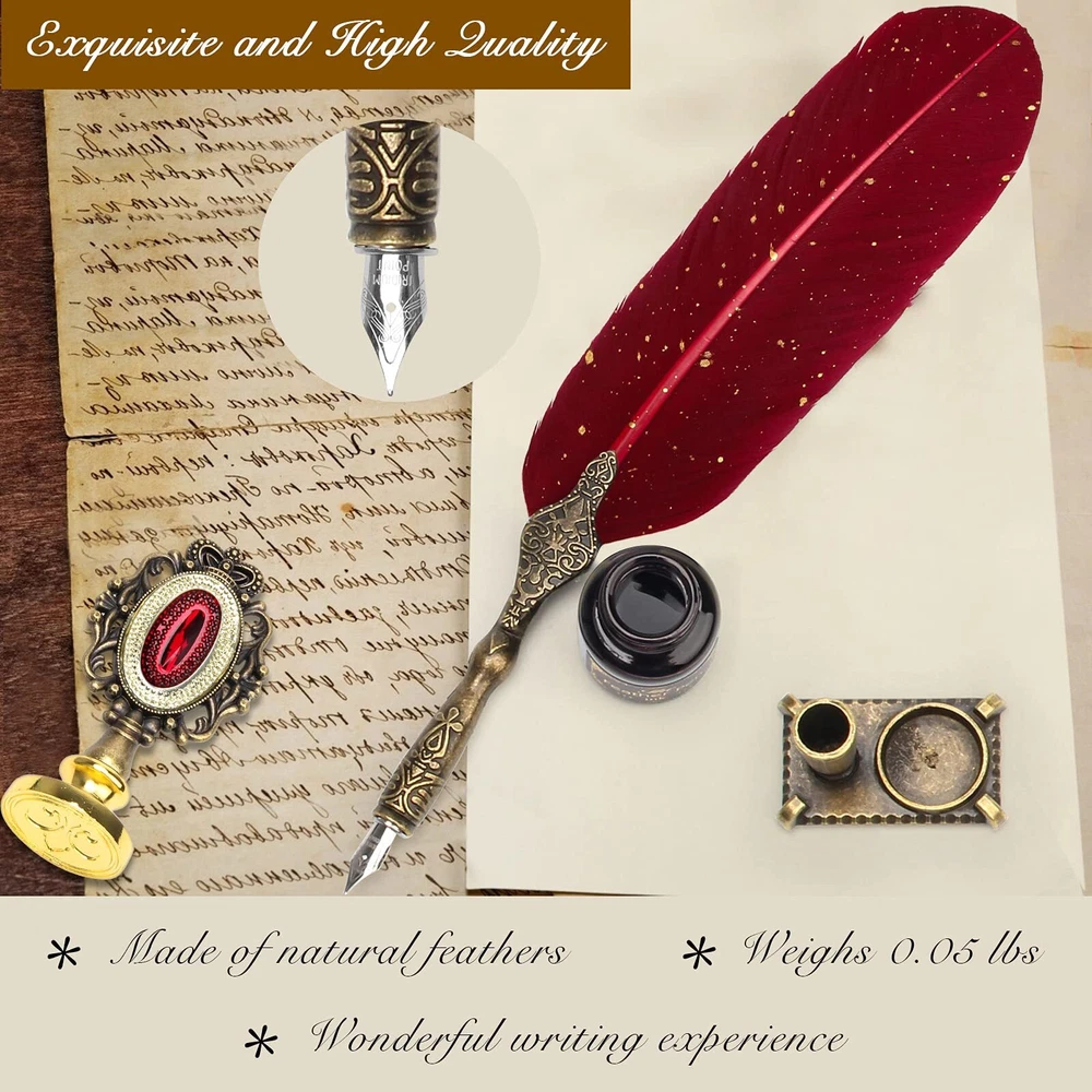What You Get : Feather calligraphy pen set included 1 wax seal stamp, 1 ink, 1 wax seal stick, 5 different size nibs, 1 spoon, 1 envelope, and 1 letter paper, 1 white wax, all-in-feather quill set is the best gift for friends and family Choicest Quality : Quill pen made of natural feathers and brass, beautiful and durable, weighs 0.05 lbs, and its stability and smoothness provide you with a wonderful writing experience 5 Nibs : Feather pen and ink set has 5 different size nibs made from premium metal, you can replace the nibs as your writing needs. don’t forget! there are an envelope and letter paper for a gift in the vintage ink pen package Privacy Wax Stamp : Wax seal stamp of harry potter quill and ink set exquisitely carved from metal, vintage crown jewel style, beautiful and premium, the envelope is sealed with wax for privacy, which can protect your envelope from being opened Perfect Gift : Calligraphy pens quill package size is 8 X 11in, exquisite packaging and high-end quality make it of the most popular gifts at the moment, especially for children and friends' birthdays