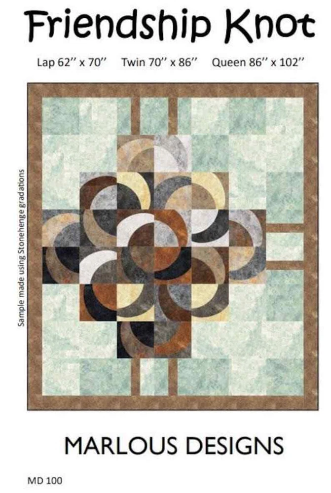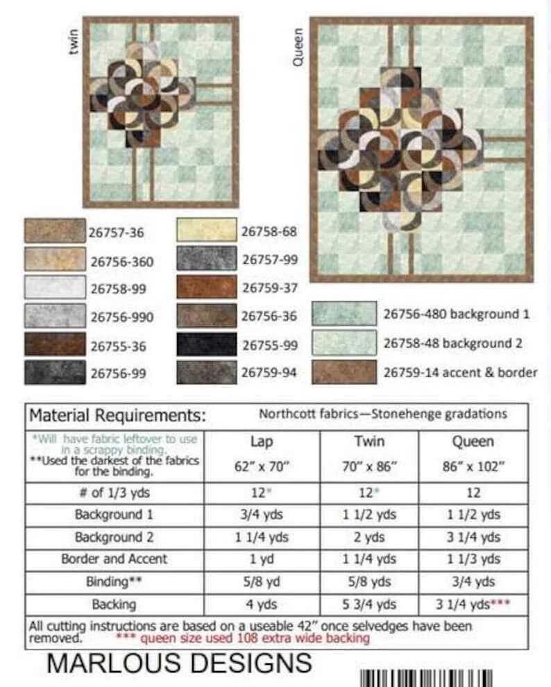 Quilt Kit~Friendship Knot~62" x 70" Stonehenge Gradations II Lap/Throw Quilt (Includes pattern & fabric for top of quilt/binding) Have some fun with free hand curves and no seams to match. It's much easier than it looks! This kit is for the lap/throw size quilt measuring 62" x 70". The pattern includes instructions for twin and queen size quilts as well which would require additional fabric. Picture 10 show fabric requirements for the lap/throw and the two larger quilts so that you can calculate how much additional fabric you would need if you want to make this quilt larger. FABRIC: Stonehenge Gradations II by Linda Ludovico for Northcott Fabrics features a wide variety of tonal stone-look fabrics including sienna marble, quartz, slate, sandstone and limestone textures. 100% cotton fabric. Machine wash cold water, tumble dry cool, do not bleach, iron on back if necessary. Fabrics printed in Korea. The overall finished size of this lap/throw quilt as shown in picture 1 is 62" x 70". The kit contains a purchased copy of the Friendship Knot quilt pattern and instructions designed by Marlous Designs along with enough fabric to complete the quilt top and edge binding as shown in picture 1. BACKING FABRIC AND BATTING WILL NEED TO BE PURCHASED SEPARATELY. Printed fabrics in this kit are from the Stonehenge Gradations II collection designed by Linda Ludovico for Northcott. Pictures 2 thru 9 show the pattern and fabrics included in this kit. There are no substitutions in this kit! Skill Level: Confident Beginner 4 yards is recommended for backing fabric of the lap/throw size quilt assuming a standard 43/44" width along with an 70" x 78" piece of batting. Backing fabric and batting are NOT included in this kit. A little over 7-5/8 yards of fabric is included in this kit along with the pattern. NOTE: FABRICS IN THIS KIT ARE PACKAGED IN THE SAME ORDER AS LISTED ON THE PATTERN SO THAT YOU CAN EASILY ORGANIZE OR MARK THEM USING YOUR FAVORITE METHOD! Learn more about this item