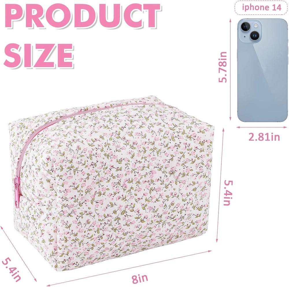 This quilted makeup bag is absolutely adorable! The floral design is so cute and feminine, perfect for keeping my cosmetics organized. The puffy cotton material feels soft yet durable, and the size is just right—fits all my essentials without being bulky. Love how versatile it is—great for travel, daily use, or even as a cute little gift. The quality feels amazing for the price, and the pink color is just as pretty in person. A must-have for anyone who loves stylish and practical beauty storage!