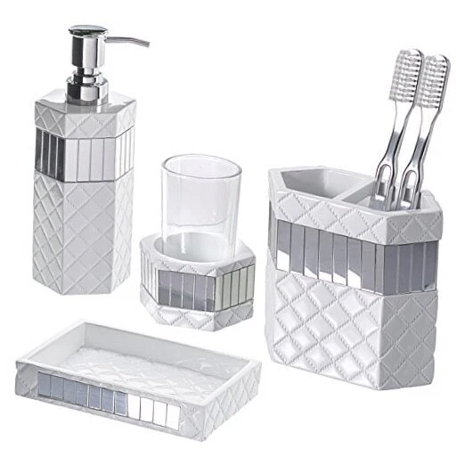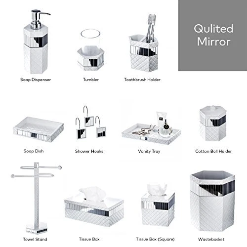 Return Policy Fast Delivery Trusted seller Quilted Mirror White Bathroom Accessories Set - Decorative 4 Piece Bathroom Set - Mirrored Bathroom Accessory Set Includes: Soap Dispenser, Toothbrush Holder, Tumbler & Soap Dish Product Description This Bathroom Accessory Set is Made of Quality Resin Material Bathroom Accessories Sets Complete: These 4-Piece Bathroom Sets Include A Toothbrush Holder With Two Slots For Convenience; Soap Dispenser: The Wide Mouth Makes Refills So Easy. Tumbler: Is Perfect For A Rinse After Brushing Or To Use As A Toothbrush Holder. Soap Dish: Fits Soap Bars Of Most Sizes. Decorative Look: With An Enchanting Mix Of Elegant White Color And Beautiful Mirror Pieces The Bling Bathroom Soap Dispenser Set Complements Any Modern Bathroom Decor And Will Definitely Wow Your Guests! Designed To Last: All Bathroom Decor Sets Accessories Are Made Using Quality Resin Material Which Never Rusts For Enhanced Durability & Functionally, Unlike Cheap Bathroom Sets Accessories That Easily Tarnishes. Accommodates Multiple Users: The Bathroom Toothbrush Holder Set Adds A Functional Touch To Secondary And Master Bathroom Décor By Meeting The Needs Of Multiple Users. Perfect Gift Idea: Packed In A Lovely Gift Box, The Quilted Mirror Bathroom Decor Set Is A Great Toilet Accessory Gift Set. Click ‘add To Cart’ Now! Shipping Returns Payment Shipping Shipping is FREE to all addresses other than APO/PO boxes in the lower 48 states. All our stock ships from US-based warehouses. Shipped via USPS or UPS (depending on location and package weight) Unless stated otherwise, all orders will ship within 24-72 hours of your payment being processed. Check our feedback to see the great reviews of FAST shipping we offer. Returns Seller does not accept returns Payment We currently accept payment via eBay managed payments only. Once payment is cleared, we will dispatch your shipment within 1-3 business days. Please refer to the "Shipping" tab for more information regarding shipping speed to your destination.
