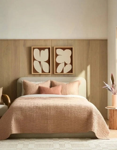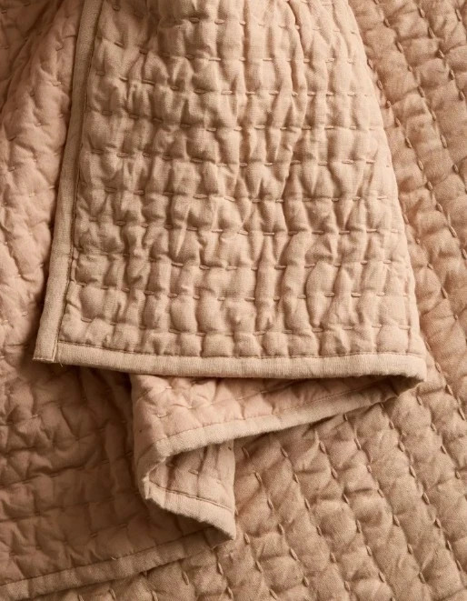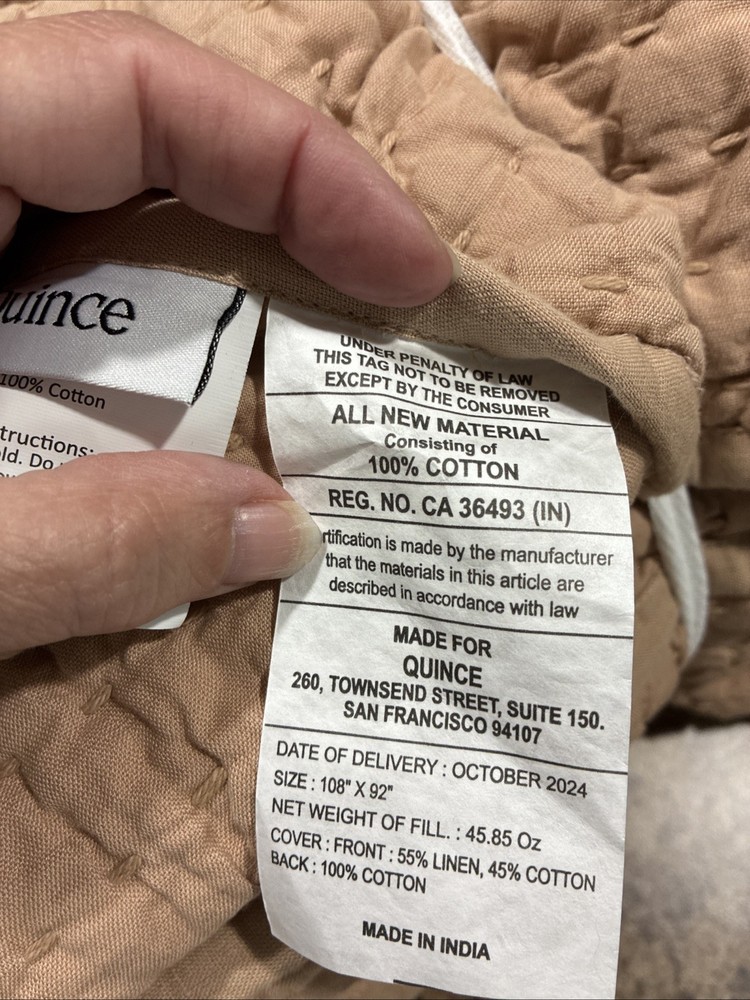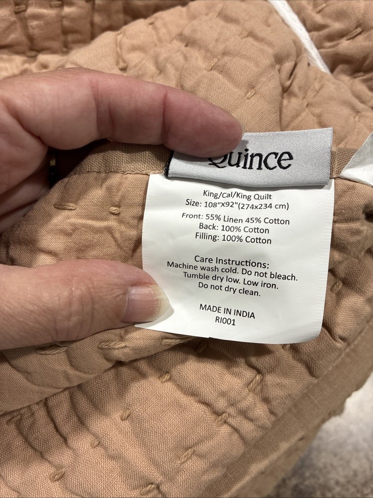 The Quince King/California King European Linen Cotton Stitch Quilt in Desert Sunset is a stylish and cozy addition to any bedroom. Made with a blend of linen and cotton, this quilt provides insulation for all seasons while being lightweight and quilted for added comfort. The solid orange color and bohemian design give it a unique and inviting look, perfect for teens, adults, and kids alike. With STANDARD 100 by OEKO-TEX certification, this quilt ensures quality and safety in its construction. Easy to care for with machine wash and tumble dry instructions, this Quince quilt is a versatile and charming choice for any home.
