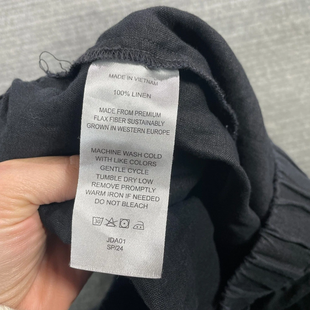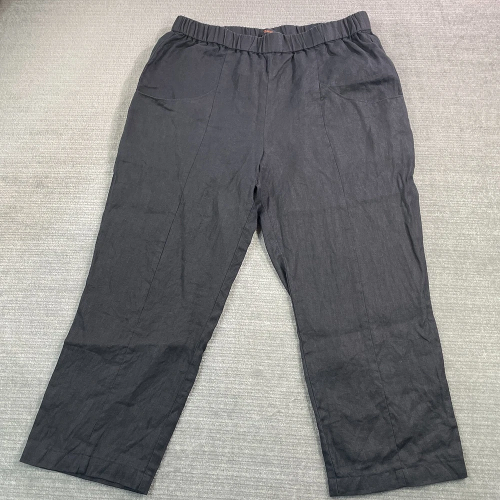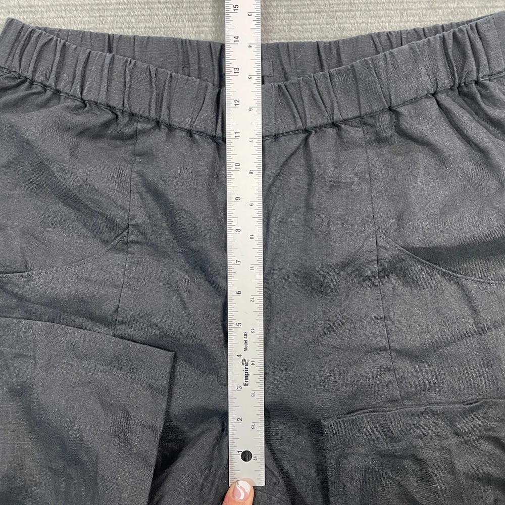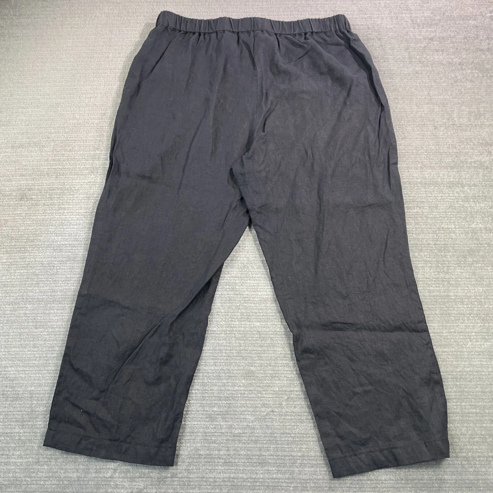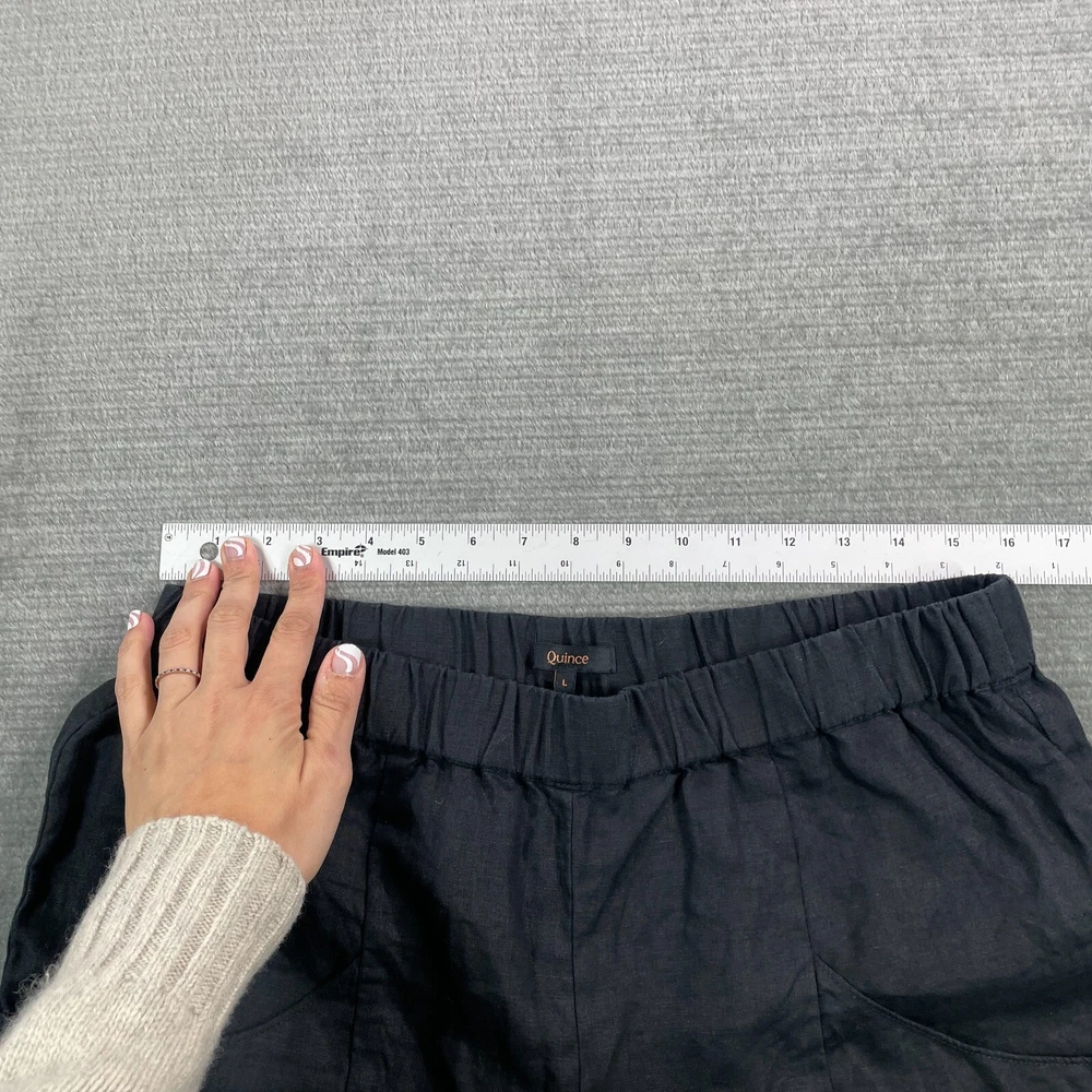 Rise: High (Greater than 10.5 in) Handmade: No Garment Care: Machine Washable Front Type: Flat Front Style: Chino Inseam: 23 in Season: Fall, Spring, Summer, Winter Waist Size: 32 in Leg Style: Tapered Fit: Classic Theme: Bohemian, City, College Closure: Pull On Department: Women Fabric Type: woven Color: Black Size: L Personalize: No Size Type: Regular Pattern: Solid Occasion: Casual, Travel Features: Crop, Stretch Material: Linen Brand: Quince Seller Notes: “Overall good used condition. No Flaws.” Type: Pants Vintage: No